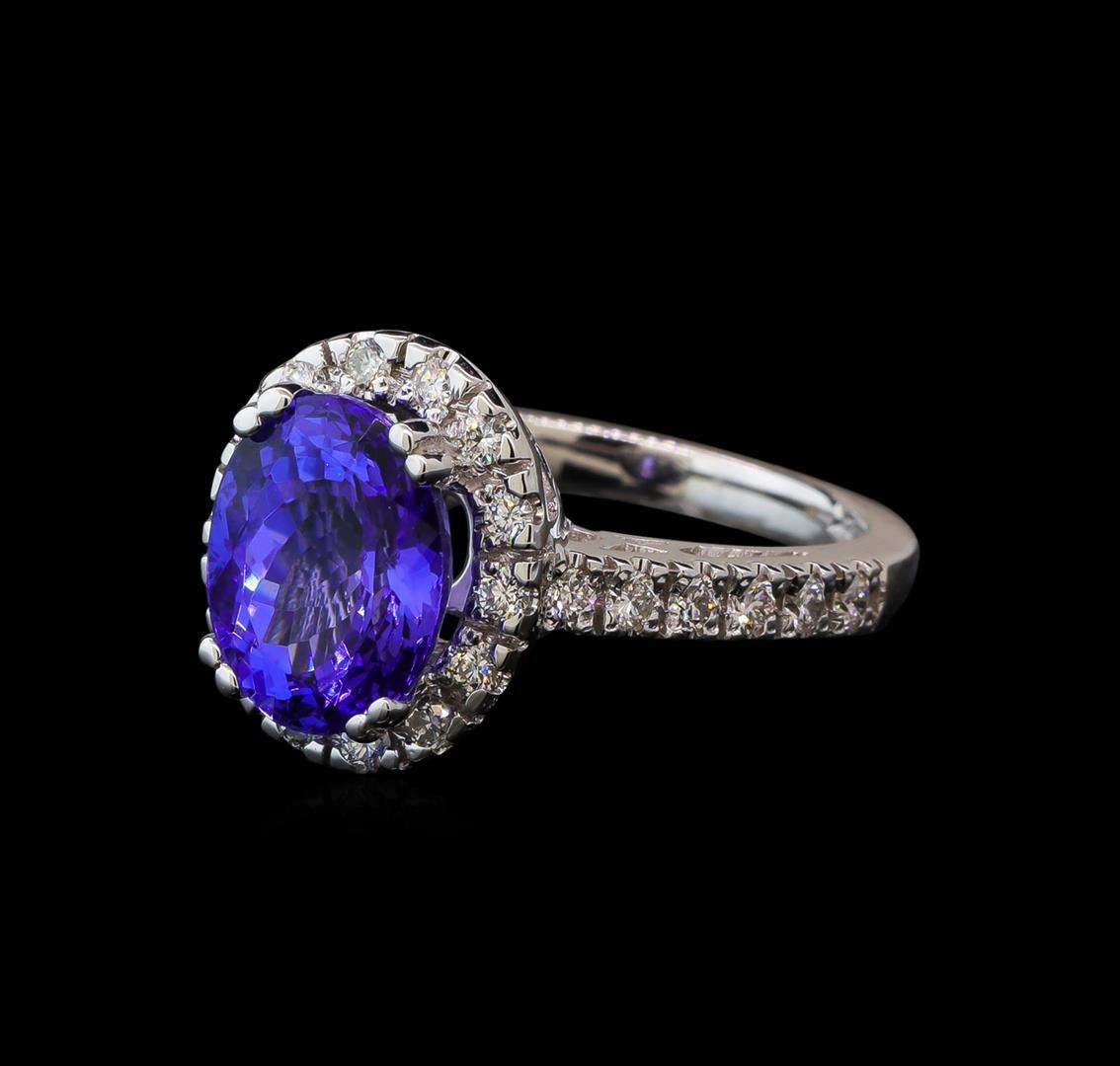 One electronically tested 14KT white gold lady's cast fashion ring with a basket halo with a bright polish finish. The featured lady's ring has a shank measuring 2.35 millimeters wide. Identified with markings of '14K'. Condition is new, good workmanship. Containing: One prong set oval modified brilliant cut natural tanzanite, measuring 10.34 x 8.15 x 5.79mm, (depth est.) approximate weight of 3.55ct., clarity is eye clean, medium dark, moderately strong, violetish blue color, (GIA vB 6/4), cut is very good. Transmitting light with no distortion, transparent. Colored gemstones are presumed to have been subjected to commonly used enhancement processes. Graded in the setting. Twelve prong set round brilliant cut diamonds, measuring 1.90 - 1.85 x 1.13mm (depth est.) approximate total weight of 12 Stones = 0.29ct. Graded in the setting. Clarity SI-1 to I-1. Color: H - I Cut Good Fourteen prong set round brilliant cut diamonds, measuring 1.70 - 1.60 x 1.02mm (depth est.) approximate total weight of 14 Stones = 0.24ct. Graded in the setting. Clarity SI-1 to SI-2. Color: G - I Cut Good. Total Weight of Colored Stones 3.55ct. Total Weight of Diamonds 0.53ct. Total Weight of Ring 6.70gm. GAS Appraised at $8,455.00.