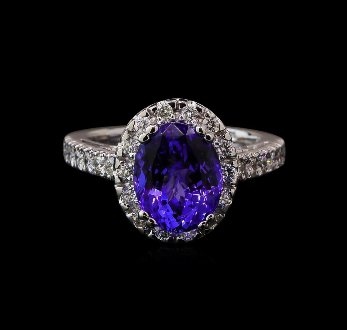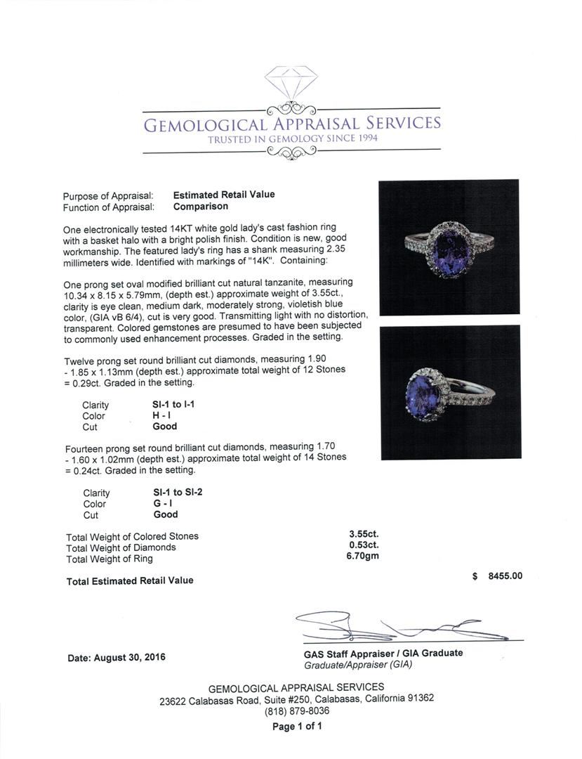 One electronically tested 14KT white gold lady's cast fashion ring with a basket halo with a bright polish finish. The featured lady's ring has a shank measuring 2.35 millimeters wide. Identified with markings of '14K'. Condition is new, good workmanship. Containing: One prong set oval modified brilliant cut natural tanzanite, measuring 10.34 x 8.15 x 5.79mm, (depth est.) approximate weight of 3.55ct., clarity is eye clean, medium dark, moderately strong, violetish blue color, (GIA vB 6/4), cut is very good. Transmitting light with no distortion, transparent. Colored gemstones are presumed to have been subjected to commonly used enhancement processes. Graded in the setting. Twelve prong set round brilliant cut diamonds, measuring 1.90 - 1.85 x 1.13mm (depth est.) approximate total weight of 12 Stones = 0.29ct. Graded in the setting. Clarity SI-1 to I-1. Color: H - I Cut Good Fourteen prong set round brilliant cut diamonds, measuring 1.70 - 1.60 x 1.02mm (depth est.) approximate total weight of 14 Stones = 0.24ct. Graded in the setting. Clarity SI-1 to SI-2. Color: G - I Cut Good. Total Weight of Colored Stones 3.55ct. Total Weight of Diamonds 0.53ct. Total Weight of Ring 6.70gm. GAS Appraised at $8,455.00.