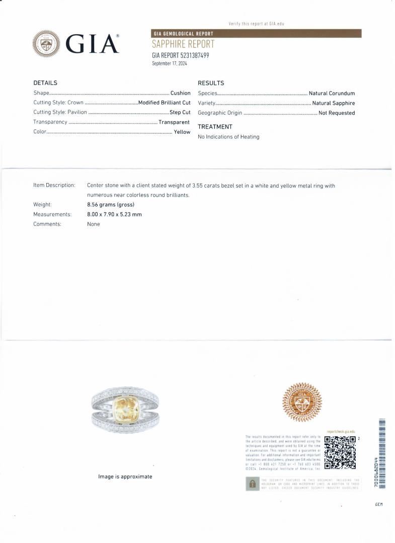 One polished, stamped, and tested 18K white and yellow gold ring marked Alex Kauffman. The ring is mounted with: 1 genuine GIA certified unheated sapphire center stone weighing approximately 3.55 carats, and 264 genuine round diamonds weighing approximately 2.35 carats. This item weighs 8.5 grams, condition is new, excellent workmanship. #MAIN GEMSTONE# GIA Report No.: 5231387499 Species: Natural Corundum Variety: Natural Sapphire Shape: Cushion Cutting Style: Modified Brilliant Cut Crown, Step Cut Pavilion Measurements: 8.00 x 7.90 x 5.23mm Weight: 3.55 carats Color: Yellow Transparency: Transparent Treatment: None Refractive Index: 1.762 - 1.770 DR Birefringence: 0.008 - 0.010 Hardness: 9 #ADJACENT GEMSTONES ON RING# Identity: Natural Diamond Shape: Round Cutting Style: Brilliant Cut Quantity: 264 Diamonds Measurements: 1.0 - 1.7mm Total Weight: 2.35 carats Clarity Grade: VS2-SI1 Color Grade: F-G Refractive Index: 2.417 Hardness: 10 SAPPHIRE WEIGHT: 3.55 ct TOTAL DIAMOND WEIGHT: 2.35 cts WEIGHT OF ITEM: 8.5 grams GOLD CONTENT: 18K White & Yellow Gold Size: 7