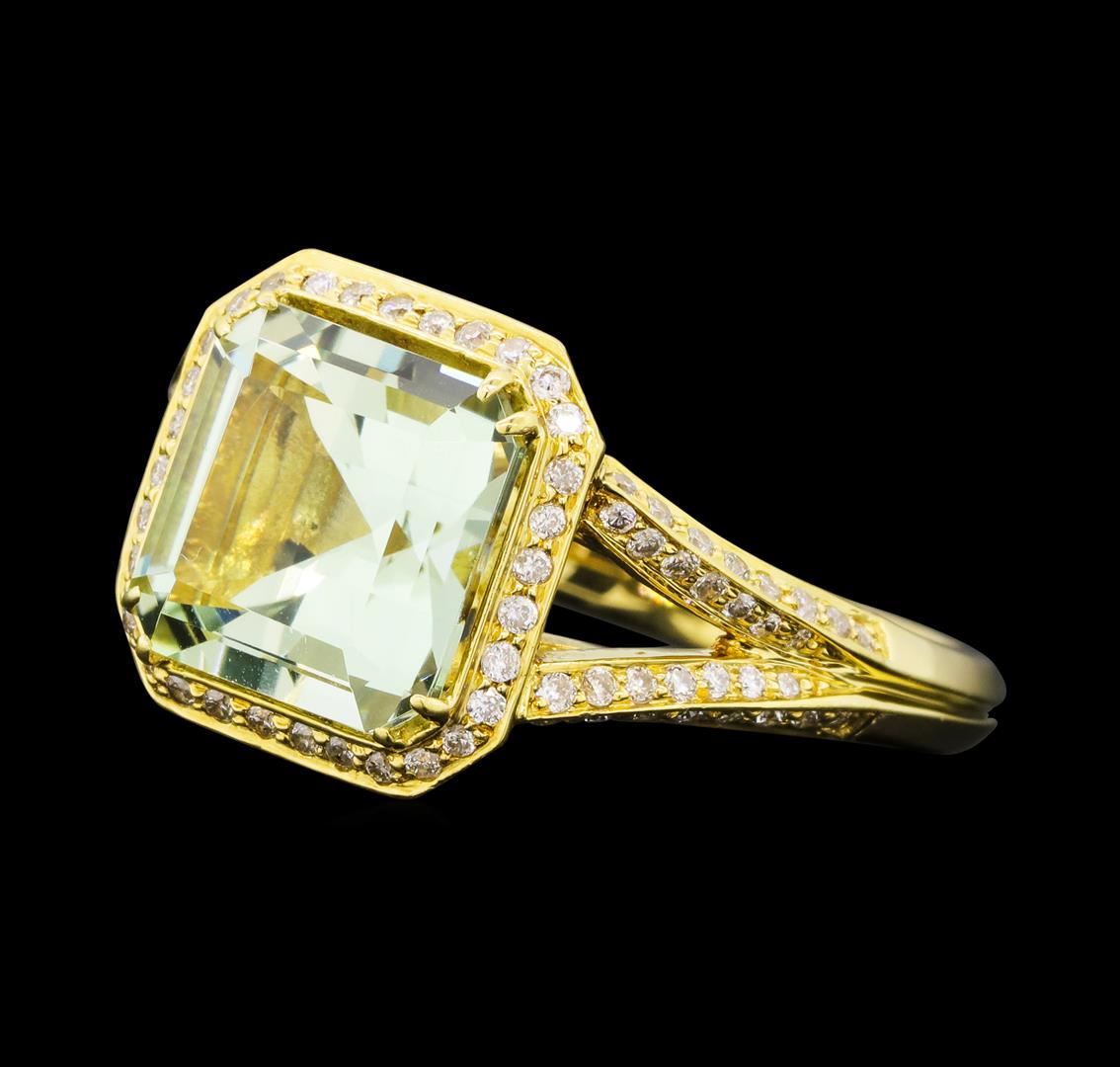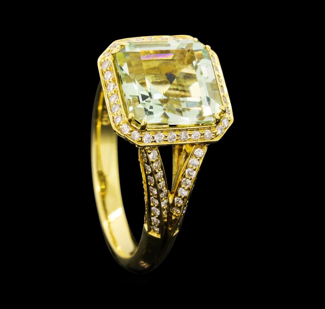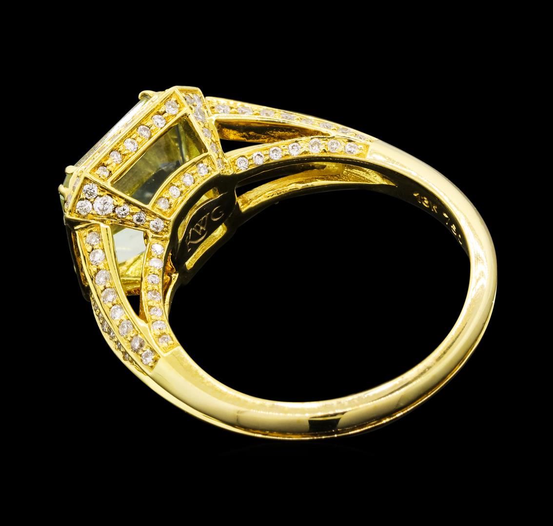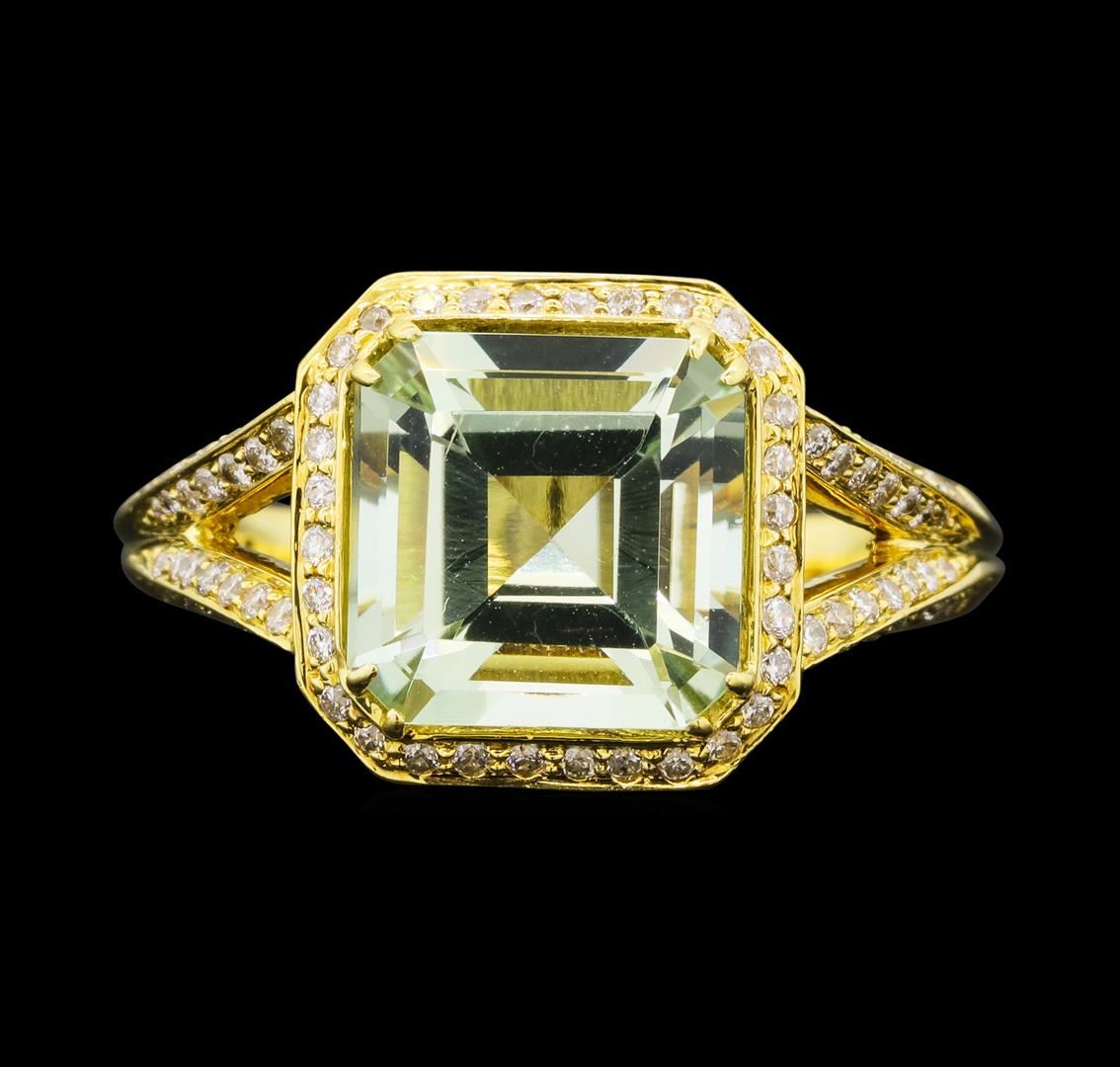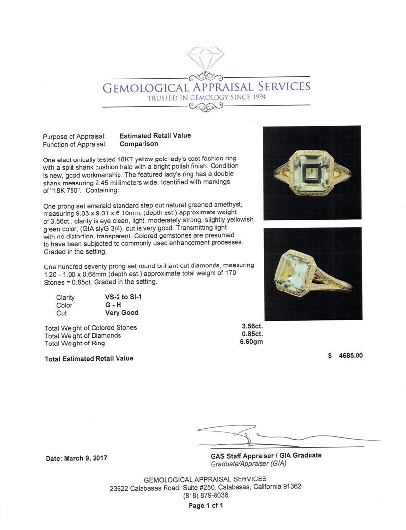 One electronically tested 18KT yellow gold lady's cast fashion ring with a split shank cushion halo with a bright polish finish. The featured lady's ring has a double shank measuring 2.45 millimeters wide. Identified with markings of '18K 750'. Condition is new, good workmanship. Containing: One prong set emerald standard step cut natural greened amethyst, measuring 9.03 x 9.01 x 6.10mm, (depth est.) approximate weight of 3.56ct., clarity is eye clean, light, moderately strong, slightly yellowish green color, (GIA slyG 3/4), cut is very good. Transmitting light with no distortion, transparent. Colored gemstones are presumed to have been subjected to commonly used enhancement processes. Graded in the setting. One Hundred Seventy prong set round brilliant cut diamonds, measuring 1.20 - 1.00 x 0.68mm (depth est.) approximate total weight of 170 Stones = 0.85ct. Graded in the setting. Color G - H Clarity VS-2 to SI-1 Cut Very Good. Total Weight of Colored Stones 3.56ct.. Total Weight of Diamonds 0.85ct.. Total Weight of Ring 6.60gm GAS Appraised at $4,685.00.