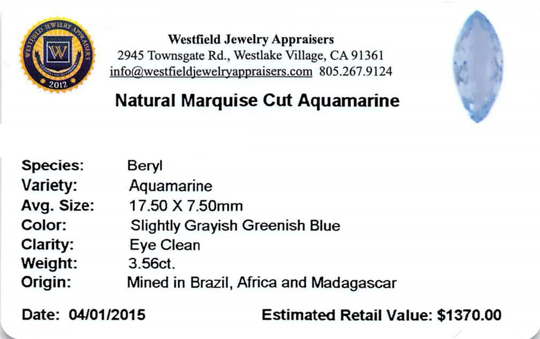 One marquise cut natural aquamarine exact weight 3.56ct., clarity is eye clean, type I, medium, slightly grayish, very slightly greenish blue color, (GIA vslgB 5/2), cut is good. Westfield Appraised at $1,370.00.