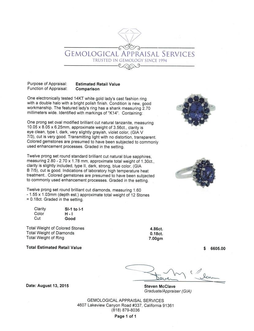 One electronically tested 14KT white gold lady's cast fashion ring with a double halo with a bright polish finish. The featured lady's ring has a shank measuring 2.70 millimeters wide. Identified with markings of "K14". Condition is new, good workmanship. Containing: One prong set oval modified brilliant cut natural tanzanite, measuring 10.05 x 8.05 x 6.25mm, approximate weight of 3.56ct., clarity is eye clean, type I, dark, very slightly grayish, violet color, (GIA V 7/3), cut is very good. Transmitting light with no distortion, transparent. Colored gemstones are presumed to have been subjected to commonly used enhancement processes. Graded in the setting. Twelve prong set round standard brilliant cut natural blue sapphires, measuring 2.80 - 2.70 x 1.78 mm, approximate total weight of 1.30ct., clarity is slightly included, type II, dark, strong, blue color, (GIA B 7/5), cut is good. Indications of laboratory high temperature heat treatment. Colored gemstones are presumed to have been subjected to commonly used enhancement processes. Graded in the setting. Twelve prong set round brilliant cut diamonds, measuring 1.60 - 1.55 x 1.03mm (depth est.) approximate total weight of 12 Stones = 0.18ct. Graded in the setting. Clarity: SI-1 to I-1. Color: H - I. Cut Good. Total Weight of Colored Stones 4.86ct. Total Weight of Diamonds 0.18ct. Total Weight of Ring 7.00gm. GAS Appraised at $6,605.00.
