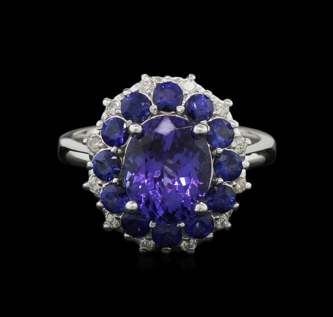 One electronically tested 14KT white gold lady's cast fashion ring with a double halo with a bright polish finish. The featured lady's ring has a shank measuring 2.70 millimeters wide. Identified with markings of "K14". Condition is new, good workmanship. Containing: One prong set oval modified brilliant cut natural tanzanite, measuring 10.05 x 8.05 x 6.25mm, approximate weight of 3.56ct., clarity is eye clean, type I, dark, very slightly grayish, violet color, (GIA V 7/3), cut is very good. Transmitting light with no distortion, transparent. Colored gemstones are presumed to have been subjected to commonly used enhancement processes. Graded in the setting. Twelve prong set round standard brilliant cut natural blue sapphires, measuring 2.80 - 2.70 x 1.78 mm, approximate total weight of 1.30ct., clarity is slightly included, type II, dark, strong, blue color, (GIA B 7/5), cut is good. Indications of laboratory high temperature heat treatment. Colored gemstones are presumed to have been subjected to commonly used enhancement processes. Graded in the setting. Twelve prong set round brilliant cut diamonds, measuring 1.60 - 1.55 x 1.03mm (depth est.) approximate total weight of 12 Stones = 0.18ct. Graded in the setting. Clarity: SI-1 to I-1. Color: H - I. Cut Good. Total Weight of Colored Stones 4.86ct. Total Weight of Diamonds 0.18ct. Total Weight of Ring 7.00gm. GAS Appraised at $6,605.00.