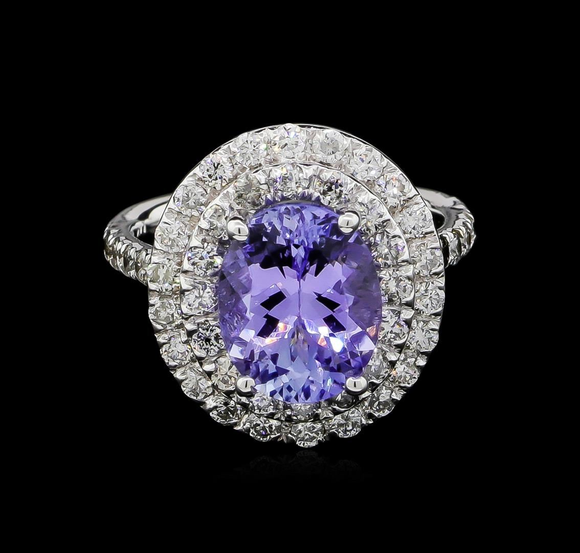 One electronically tested 14KT white gold ladies cast tanzanite and diamond ring with a bright polish finish. The featured tanzanite is set within tiered diamond bezels supported by a tuliped under gallery and diamond ribbon shoulders, completed by a two millimeter wide band. Identified with markings of "14K". Condition is new, good workmanship. Containing: One prong set oval mixed cut natural tanzanite, measuring 10.50 x 8.40 x 5.46mm, 5%. bulge factor, approximate weight of 3.56ct., clarity is eye clean, type I, medium, very slightly grayish, violet color, (GIA V 5/3), cut is good. Transmitting light with no distortion, transparent. Graded in the setting. Tanzanite is a very rare gemstone that is only found in the country of Tanzania. Originally discovered in 1967. Tiffany & Company, named the stone Tanzanite. It is found in the Usumburu Mountains that border the Umba Valley of northern Tanzania. Tanzanite occurs in gray, brown, violet, blue, reddish-purple, & green. The gem is interesting because of its exceptional pleochroism. Rotated in different directions a tanzanite will exhibit multiple changes of color. Tanzanite has a low tolerance to ultrasonic cleaning, and should not be cleaned using this method. Fifty-Six prong set round brilliant cut diamonds, measuring 1.90 - 1.80 x 1.11mm (depth est.) approximate total weight of 56 Stones = 1.39ct. Graded in the setting. Clarity: SI-2 to I-2. Color: G - I. Total Weight of Colored Stones 3.56ct. Total Weight of Diamonds 1.39ct. Total Weight of Ring 5.60gm AIG Appraised at $10,225.00.