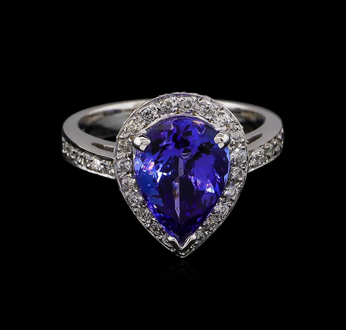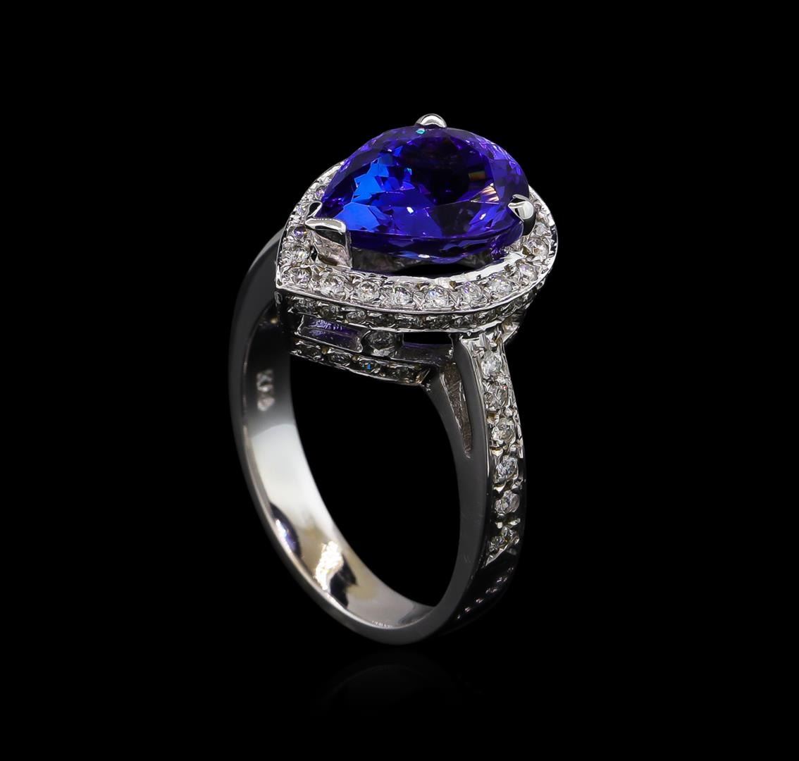 One electronically tested 14KT white gold lady's cast fashion ring with a cathedral halo with a bright polish finish. The featured lady's ring has a shank measuring 3.34 millimeters wide. Identified with markings of "K14". Condition is new, good workmanship. Containing: One prong set pear modified brilliant cut natural tanzanite, measuring 11.62 x 8.66 x 6.06mm, approximate weight of 3.56ct., clarity is eye clean, type I, medium dark, moderately strong, violetish blue color, (GIA vB 6/4), cut is very good. Transmitting light with no distortion, transparent. Colored gemstones are presumed to have been subjected to commonly used enhancement processes. Graded in the setting. Thirty-Seven prong set round brilliant cut diamonds, measuring 1.40 - 1.30 x 0.81mm (depth est.) approximate total weight of 37 Stones = 0.33ct. Graded in the setting. Clarity: SI-1 to SI-2. Color: H - I. Cut Good Forty-Seven prong set round brilliant cut diamonds, measuring 1.10 - 1.05 x 0.66mm (depth est.) , 2.00.%. GTCF approximate total weight of 47 Stones = 0.22ct. Graded in the setting. Clarity: SI-1 to I-1. Color: H - I. Cut Good. Total Weight of Colored Stones 3.56ct. Total Weight of Diamonds 0.55ct. Total Weight of Ring 6.60gm GAS Appraised.