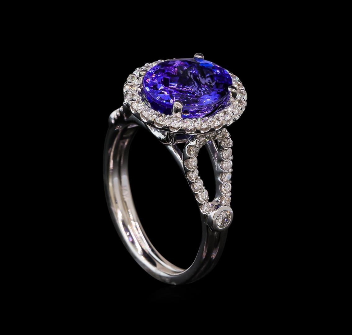 One electronically tested 14KT white gold lady's cast fashion ring with a split shank basket halo with a bright polish finish. The featured lady's ring has a double shank measuring 2.81 millimeters wide. Identified with markings of '14K'. Condition is new, good workmanship. Containing: One prong set oval modified brilliant cut natural tanzanite, measuring 10.42 x 8.38 x 5.72mm, (depth est.) approximate weight of 3.56ct., clarity is eye clean, medium dark, moderately strong, violetish blue color, (GIA vB 6/4), cut is good. Transmitting light with no distortion, transparent. Colored gemstones are presumed to have been subjected to commonly used enhancement processes. Graded in the setting. Two bezel set round brilliant cut diamonds, measuring 2.20 - 2.15 x 1.35mm (depth est.) approximate total weight of 2 Stones = 0.08ct. Graded in the setting. Clarity SI-1. Color: H - I Cut Good Twenty-Four prong set round brilliant cut diamonds, measuring 1.50 - 1.45 x 0.92mm (depth est.) approximate total weight of 24 Stones = 0.30ct. Graded in the setting. Clarity SI-1 to I-1. Color: H - I Cut Good Thirty prong set round brilliant cut diamonds, measuring 1.35 - 1.25 x 0.78mm (depth est.) approximate total weight of 30 Stones = 0.24ct. Graded in the setting. Clarity SI-2 to I-2. Color: H - I Cut Good. Total Weight of Colored Stones 3.56ct. Total Weight of Diamonds 0.62ct. Total Weight of Ring 5.20gm. GAS Appraised at $8,525.00.