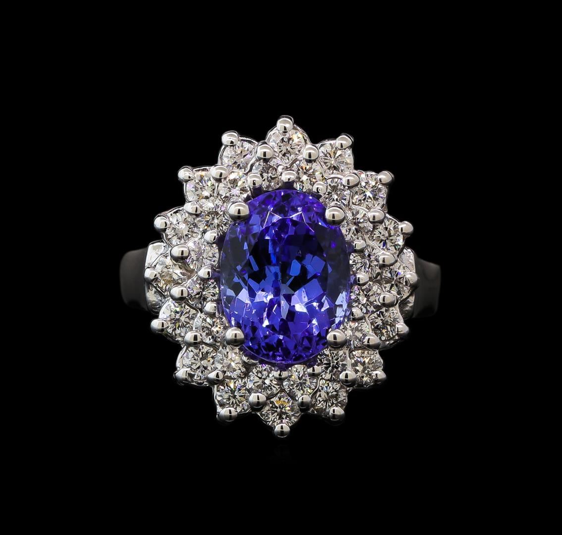 One electronically tested 14KT white gold lady's cast fashion ring with a double basket halo with a bright polish finish. The featured lady's ring has a shank measuring 2.65 millimeters wide. Identified with markings of '14K'. Condition is new, good workmanship. Containing: One prong set oval modified brilliant cut natural tanzanite, measuring 9.65 x 7.25 x 6.61mm, (depth est.) 10%. bulge factor, approximate weight of 3.56ct., clarity is eye clean, medium dark, moderately strong, bluish violet color, (GIA bV 6/4), cut is good. Transmitting light with no distortion, transparent. Colored gemstones are presumed to have been subjected to commonly used enhancement processes. Graded in the setting. Sixteen prong set round brilliant cut diamonds, measuring 2.10 - 2.00 x 1.27mm (depth est.) approximate total weight of 16 Stones = 0.53ct. Graded in the setting. Clarity SI-1 to SI-2. Color: H - I Cut Good Sixteen prong set round brilliant cut diamonds, measuring 1.90 - 1.85 x 1.17mm (depth est.) approximate total weight of 16 Stones = 0.40ct. Graded in the setting. Clarity SI-1 to SI-2. Color: H - I Cut Good. Total Weight of Colored Stones 3.56ct.. Total Weight of Diamonds 0.93ct.. Total Weight of Ring 6.90gm GAS Appraised at $9,000.00.