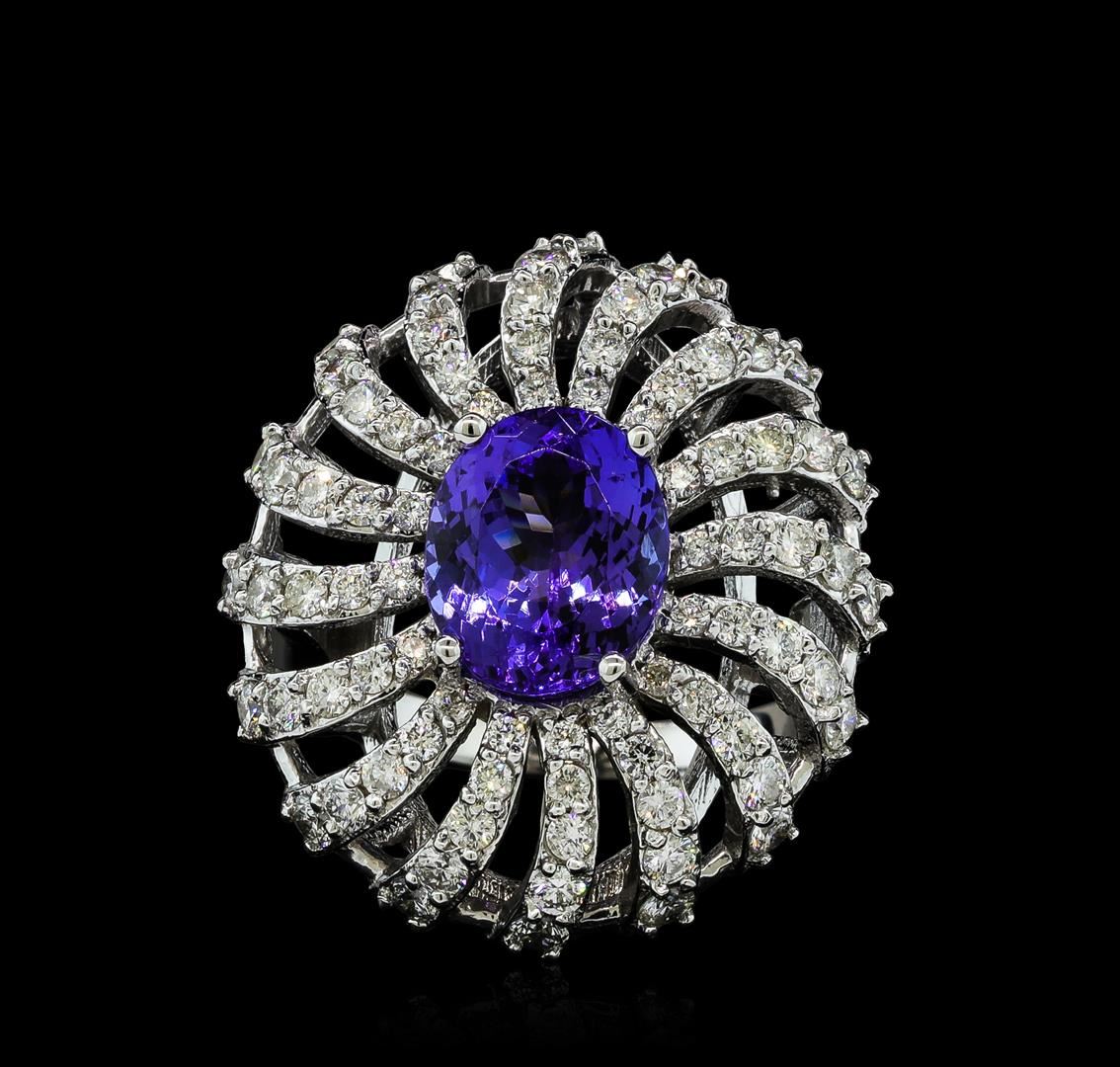 One electronically tested 14KT white gold lady's cast fashion ring with a spiral halo with a bright polish finish. The featured lady's ring has a shank measuring 2.16 millimeters wide. Identified with markings of 'K14'. Condition is new, good workmanship. Containing: One prong set oval modified brilliant cut natural tanzanite, measuring 10.38 x 8.49 x 5.58mm, (depth est.) approximate weight of 3.56ct., clarity is eye clean, medium dark, strong, violetish blue color, (GIA vB 6/5), cut is very good. Transmitting light with no distortion, transparent. Colored gemstones are presumed to have been subjected to commonly used enhancement processes. Graded in the setting. Thirty-Two prong set round brilliant cut diamonds, measuring 2.10 - 1.90 x 1.24mm (depth est.) approximate total weight of 32 Stones = 0.99ct. Graded in the setting. Clarity SI-1 to SI-2. Color: H - I Cut Good Sixteen prong set round brilliant cut diamonds, measuring 1.80 - 1.70 x 1.05mm (depth est.) approximate total weight of 16 Stones = 0.31ct. Graded in the setting. Clarity SI-1 to I-1. Color: H - I Cut Good Sixteen prong set round brilliant cut diamonds, measuring 1.60 - 1.50 x 0.93mm (depth est.) approximate total weight of 16 Stones = 0.22ct. Graded in the setting. Clarity SI-1 to I-1. Color: H - I Cut Good Sixteen prong set round brilliant cut diamonds, measuring 1.40 - 1.35 x 0.86mm (depth est.) approximate total weight of 16 Stones = 0.16ct. Graded in the setting. Clarity SI-1 to SI-2. Color: H - I Cut Good. Total Weight of Colored Stones 3.56ct.. Total Weight of Diamonds 1.68ct.. Total Weight of Ring 9.60gm. GAS Appraised at $11,720.00.
