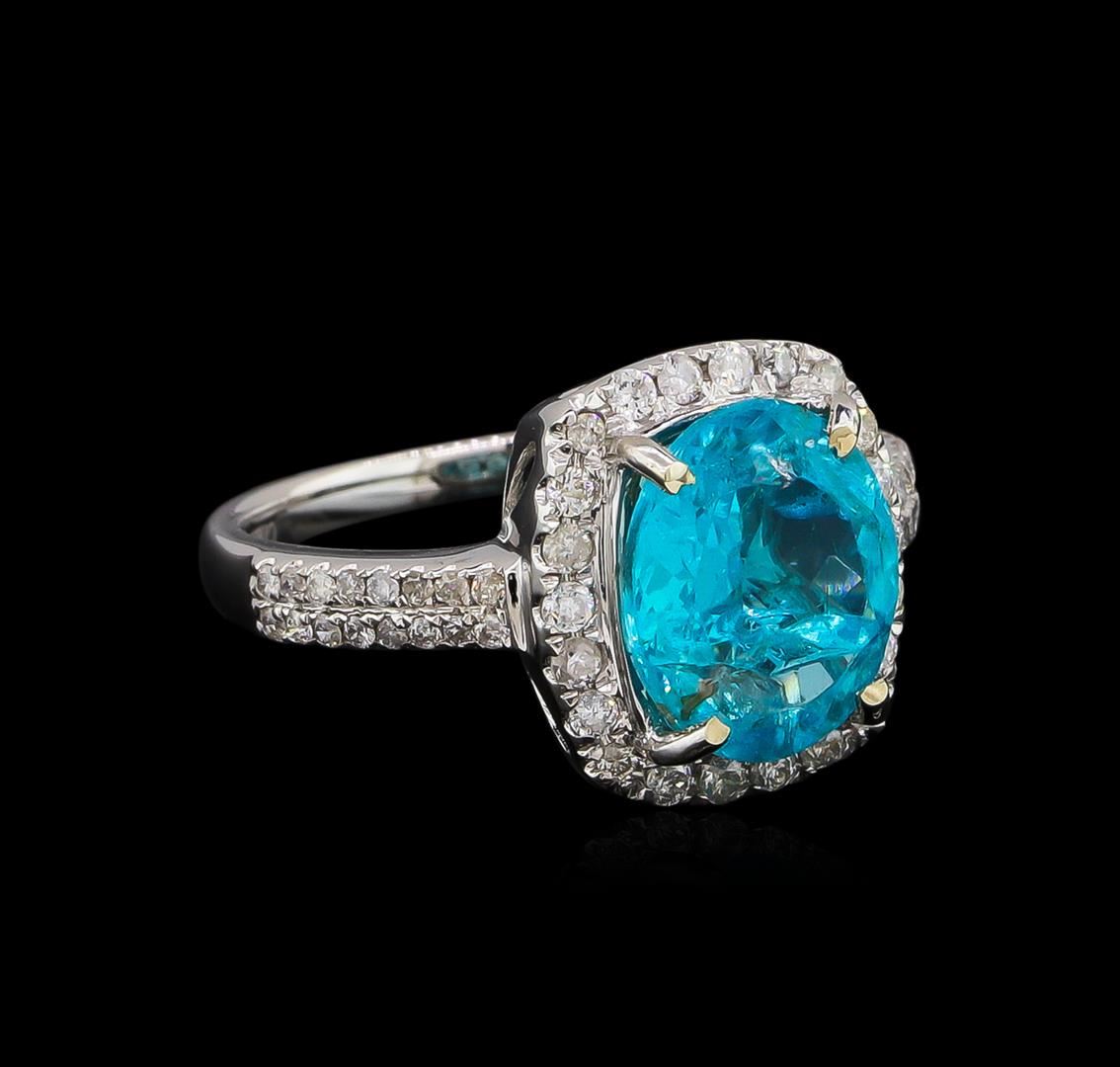 One electronically tested 14KT white gold lady's cast fashion ring with a cathedral halo with a bright polish finish. The featured ladies ring has a shank measuring 2.00 millimeters in width. Trademark is Orianne. Identified with markings of "14K". Condition is new, good workmanship. Containing: One prong set oval modified brilliant cut natural apatite, measuring 10.75 x 8.84 x 5.65mm, approximate weight of 3.57ct., clarity is moderately included, medium, moderately strong, bluish green color, (GIA bG 5/4), cut is good. Transmitting light somewhat diffusely, transparent to translucent. Naturally occurring internal & external characteristics are present. Colored gemstones are presumed to have been subjected to commonly used enhancement processes. Graded in the setting. Twenty-Two prong set round brilliant cut diamonds, measuring 1.65 - 1.60 x 0.98mm (depth est.) approximate total weight of 22 Stones = 0.33ct. Graded in the setting. Clarity: SI-2 to I-1. Color: G - Good Thirty-Two prong set round brilliant cut diamonds, measuring 1.10 - 1.00 x 0.63mm (depth est.) approximate total weight of 32 Stones = 0.13ct. Graded in the setting. Clarity: SI-2 to I-1. Color: H - I. Cut Good. Total Weight of Colored Stones 3.57ct. Total Weight of Diamonds 0.46ct. Total Weight of Ring 5.10gm. GAS Appraised at $3,695.00.