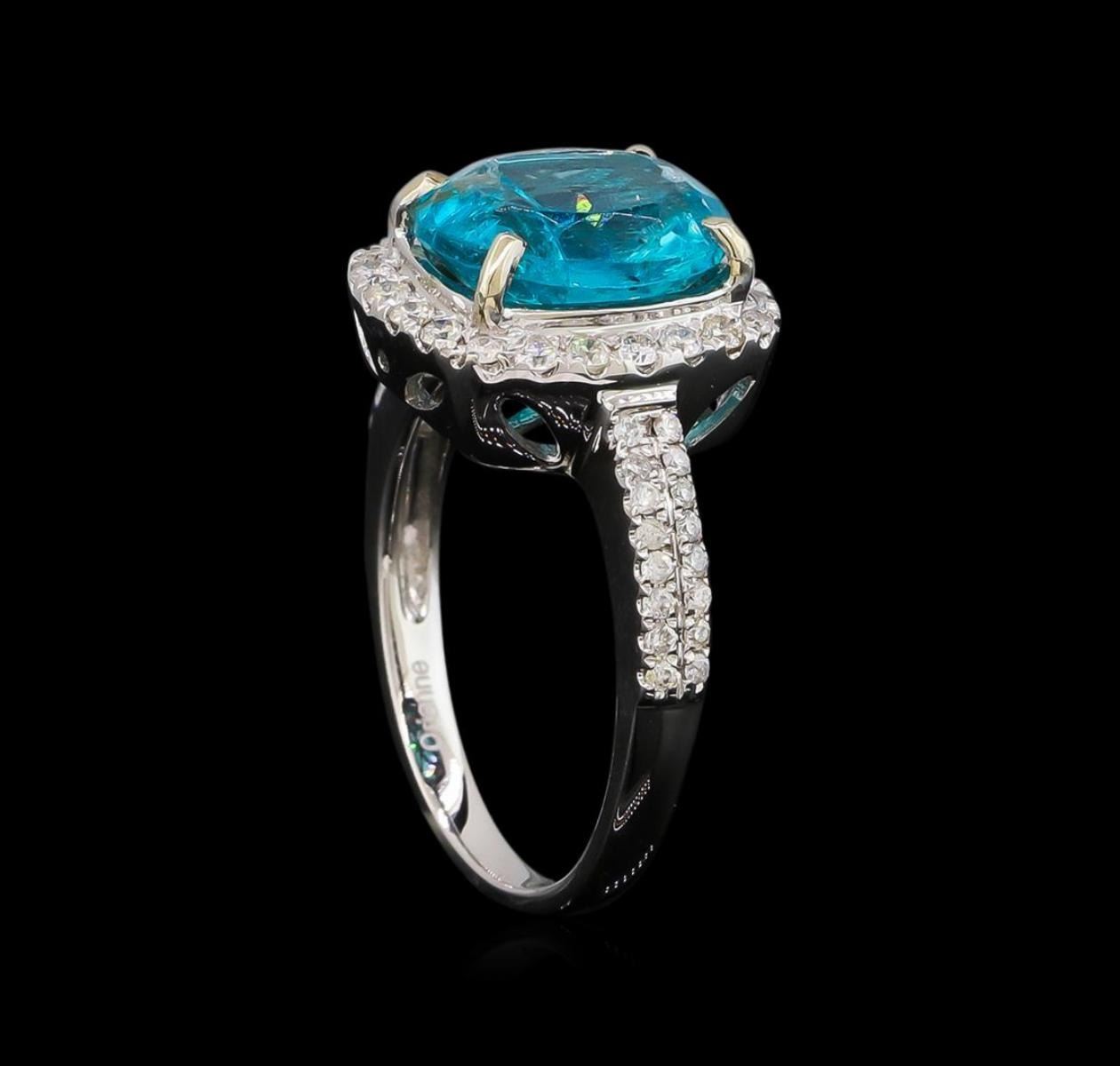 One electronically tested 14KT white gold lady's cast fashion ring with a cathedral halo with a bright polish finish. The featured ladies ring has a shank measuring 2.00 millimeters in width. Trademark is Orianne. Identified with markings of "14K". Condition is new, good workmanship. Containing: One prong set oval modified brilliant cut natural apatite, measuring 10.75 x 8.84 x 5.65mm, approximate weight of 3.57ct., clarity is moderately included, medium, moderately strong, bluish green color, (GIA bG 5/4), cut is good. Transmitting light somewhat diffusely, transparent to translucent. Naturally occurring internal & external characteristics are present. Colored gemstones are presumed to have been subjected to commonly used enhancement processes. Graded in the setting. Twenty-Two prong set round brilliant cut diamonds, measuring 1.65 - 1.60 x 0.98mm (depth est.) approximate total weight of 22 Stones = 0.33ct. Graded in the setting. Clarity: SI-2 to I-1. Color: G - Good Thirty-Two prong set round brilliant cut diamonds, measuring 1.10 - 1.00 x 0.63mm (depth est.) approximate total weight of 32 Stones = 0.13ct. Graded in the setting. Clarity: SI-2 to I-1. Color: H - I. Cut Good. Total Weight of Colored Stones 3.57ct. Total Weight of Diamonds 0.46ct. Total Weight of Ring 5.10gm. GAS Appraised.
