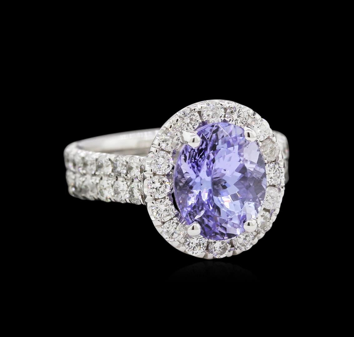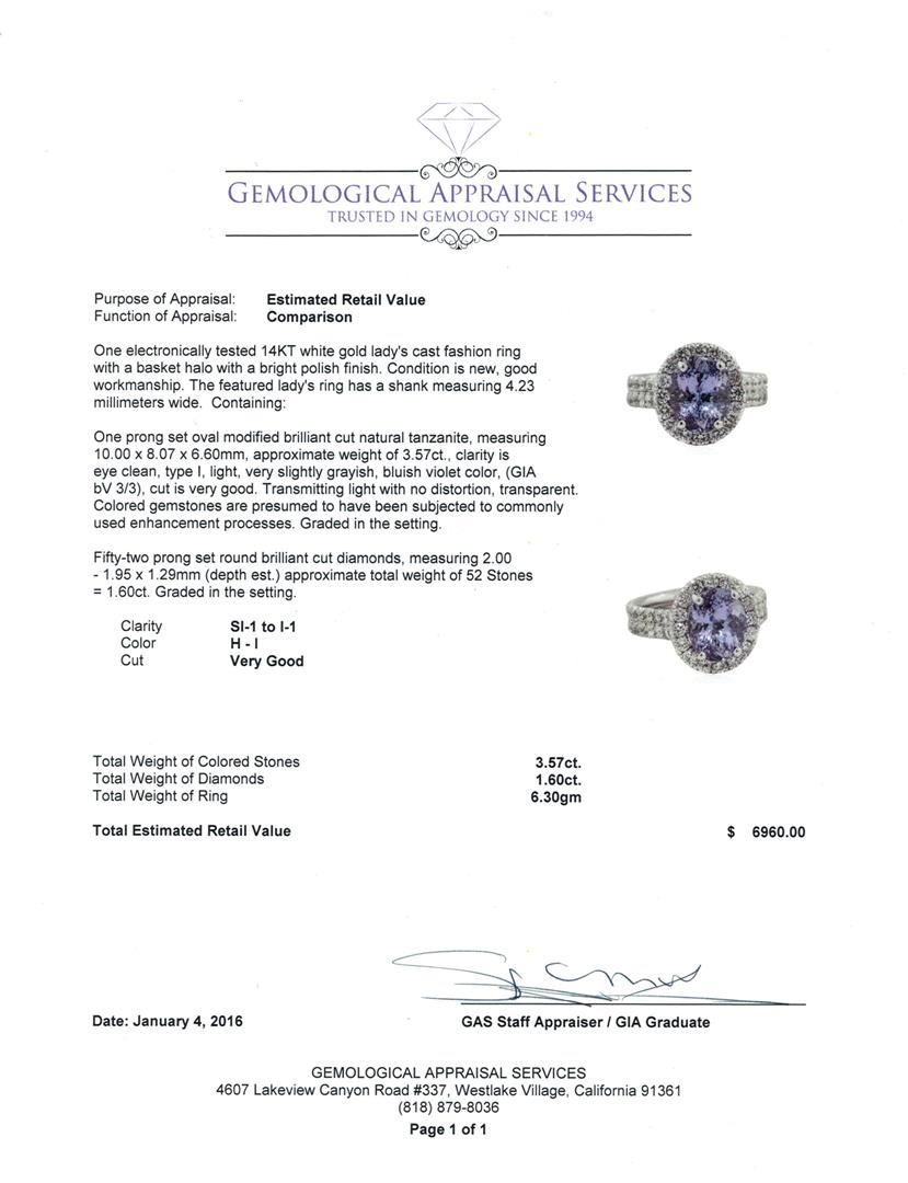 One electronically tested 14KT white gold lady's cast fashion ring with a basket halo with a bright polish finish. The featured lady's ring has a shank measuring 4.23 millimeters wide. Condition is new, good workmanship. Containing: One prong set oval modified brilliant cut natural tanzanite, measuring 10.00 x 8.07 x 6.60mm, approximate weight of 3.57ct., clarity is eye clean, type I, light, very slightly grayish, bluish violet color, (GIA bV 3/3), cut is very good. Transmitting light with no distortion, transparent. Colored gemstones are presumed to have been subjected to commonly used enhancement processes. Graded in the setting. Fifty-Two prong set round brilliant cut diamonds, measuring 2.00 - 1.95 x 1.29mm (depth est.) approximate total weight of 52 Stones = 1.60ct. Graded in the setting. Clarity: SI-1 to I-1. Color: H - I. Cut Very Good. Total Weight of Colored Stones 3.57ct. Total Weight of Diamonds 1.60ct. Total Weight of Ring 6.30gm. GAS Appraised at $6,960.00.