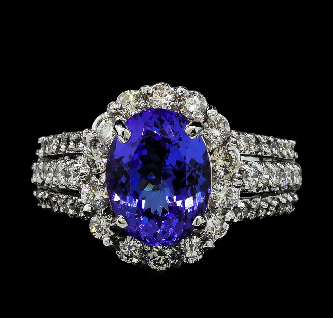 One electronically tested 14KT white gold lady's cast fashion ring with a three row basket halo with a bright polish finish. The featured lady's ring has a shank measuring 3.97 millimeters wide. Identified with markings of 'K14'. Condition is new, good workmanship. Containing: One prong set oval modified brilliant cut natural tanzanite, measuring 10.78 x 8.25 x 5.55mm, (depth est.) approximate weight of 3.57ct., clarity is eye clean, medium, moderately strong, violetish blue color, (GIA vB 5/4), cut is very good. Transmitting light with no distortion, transparent. Colored gemstones are presumed to have been subjected to commonly used enhancement processes. Graded in the setting. Fourteen prong set round brilliant cut diamonds, measuring 2.25 - 2.15 x 1.36mm (depth est.) approximate total weight of 14 Stones = 0.57ct. Graded in the setting. Clarity SI-1 to I-1. Color: H - I Cut Good Twelve prong set round brilliant cut diamonds, measuring 2.00 - 1.80 x 1.14mm (depth est.) approximate total weight of 12 Stones = 0.29ct. Graded in the setting. Clarity SI-1 to I-1. Color: H - I Cut Good Twenty-Four prong set round brilliant cut diamonds, measuring 1.55 - 1.45 x 0.93mm (depth est.) approximate total weight of 24 Stones = 0.32ct. Graded in the setting. Clarity SI-1 to SI-2. Color: H - I Cut Good. Total Weight of Colored Stones 3.57ct.. Total Weight of Diamonds 1.18ct.. Total Weight of Ring 8.00gm. GAS Appraised at $9,730.00.