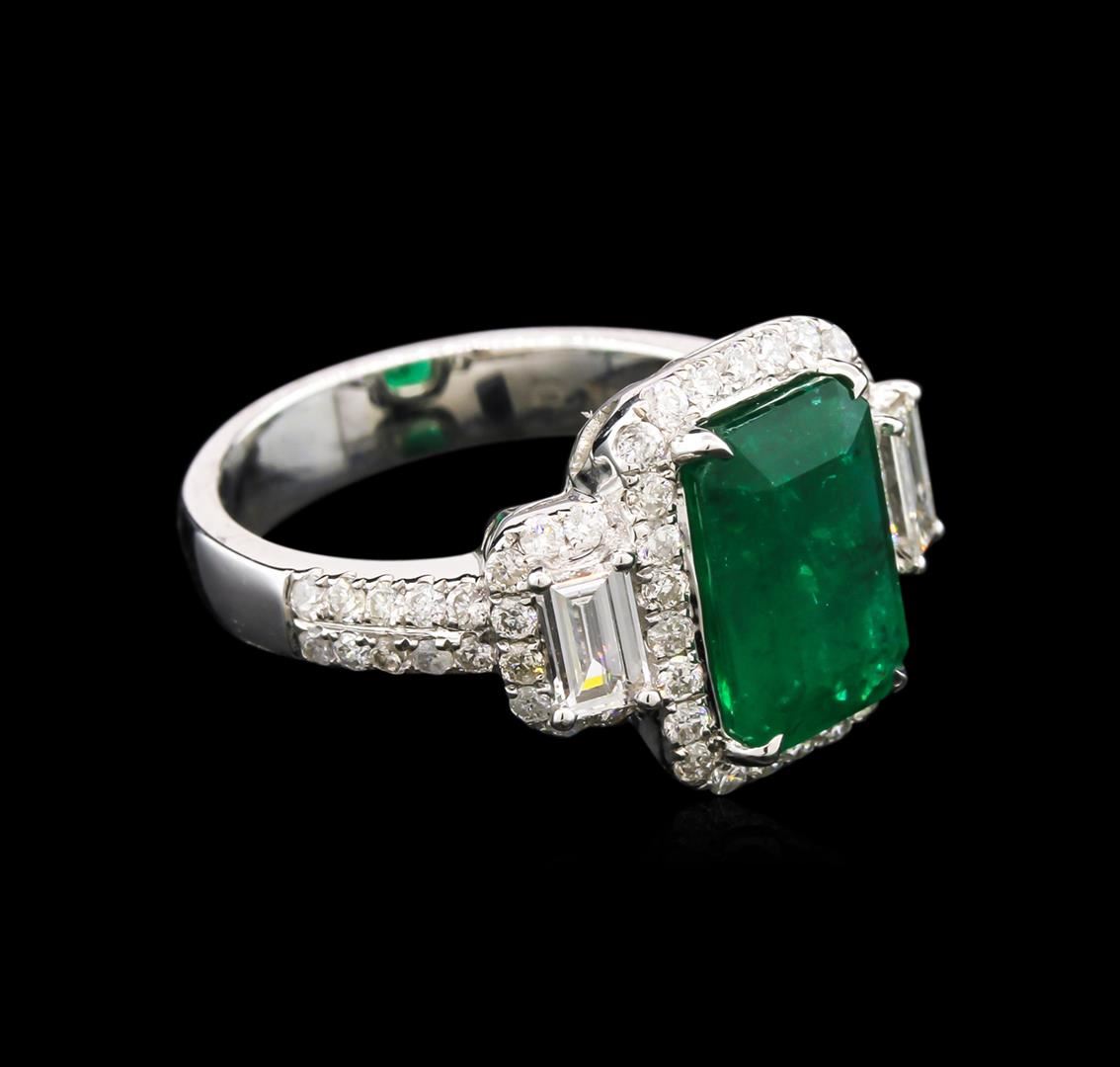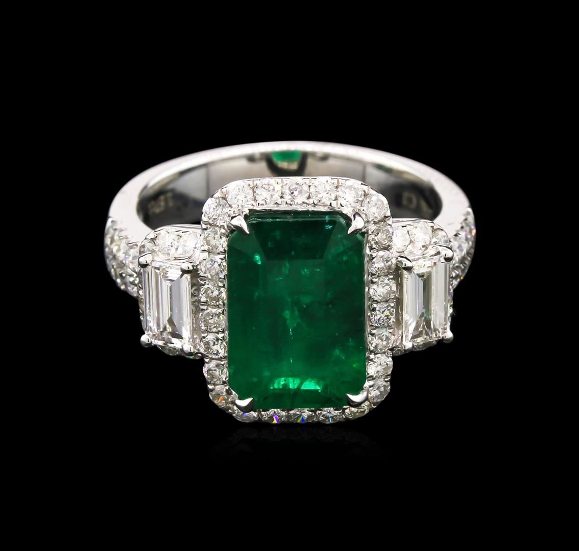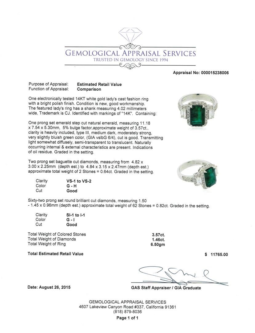 One electronically tested 14KT white gold lady's cast fashion ring with a bright polish finish. The featured lady's ring has a shank measuring 4.02 millimeters wide, Trademark is CJ. Identified with markings of "14K". Condition is new, good workmanship. Containing: One prong set emerald step cut natural emerald, measuring 11.18 x 7.54 x 5.30mm, 5% bulge factor, approximate weight of 3.57ct., clarity is heavily included, type III, medium dark, moderately strong, very slightly bluish green color, (GIA vslbG 6/4), cut is good. Transmitting light somewhat diffusely, semi-transparent to translucent. Naturally occurring internal & external characteristics are present. Indications of oil residue. Graded in the setting. Two prong set baguette cut diamonds, measuring from 4.82 x 3.00 x 2.25mm (depth est.) to 4.84 x 3.15 x 2.47mm (depth est.) approximate total weight of 2 Stones = 0.64ct. Graded in the setting. Clarity: VS-1 to VS-2. Color: G - Good Sixty-Two prong set round brilliant cut diamonds, measuring 1.50 - 1.45 x 0.96mm (depth est.) approximate total weight of 62 Stones = 0.82ct. Graded in the setting. Clarity: SI-1 to I-1. Color: G - I. Cut Good. Total Weight of Colored Stones 3.57ct. Total Weight of Diamonds 1.46ct. Total Weight of Ring 6.50gm. GAS Appraised at $11,765.00.