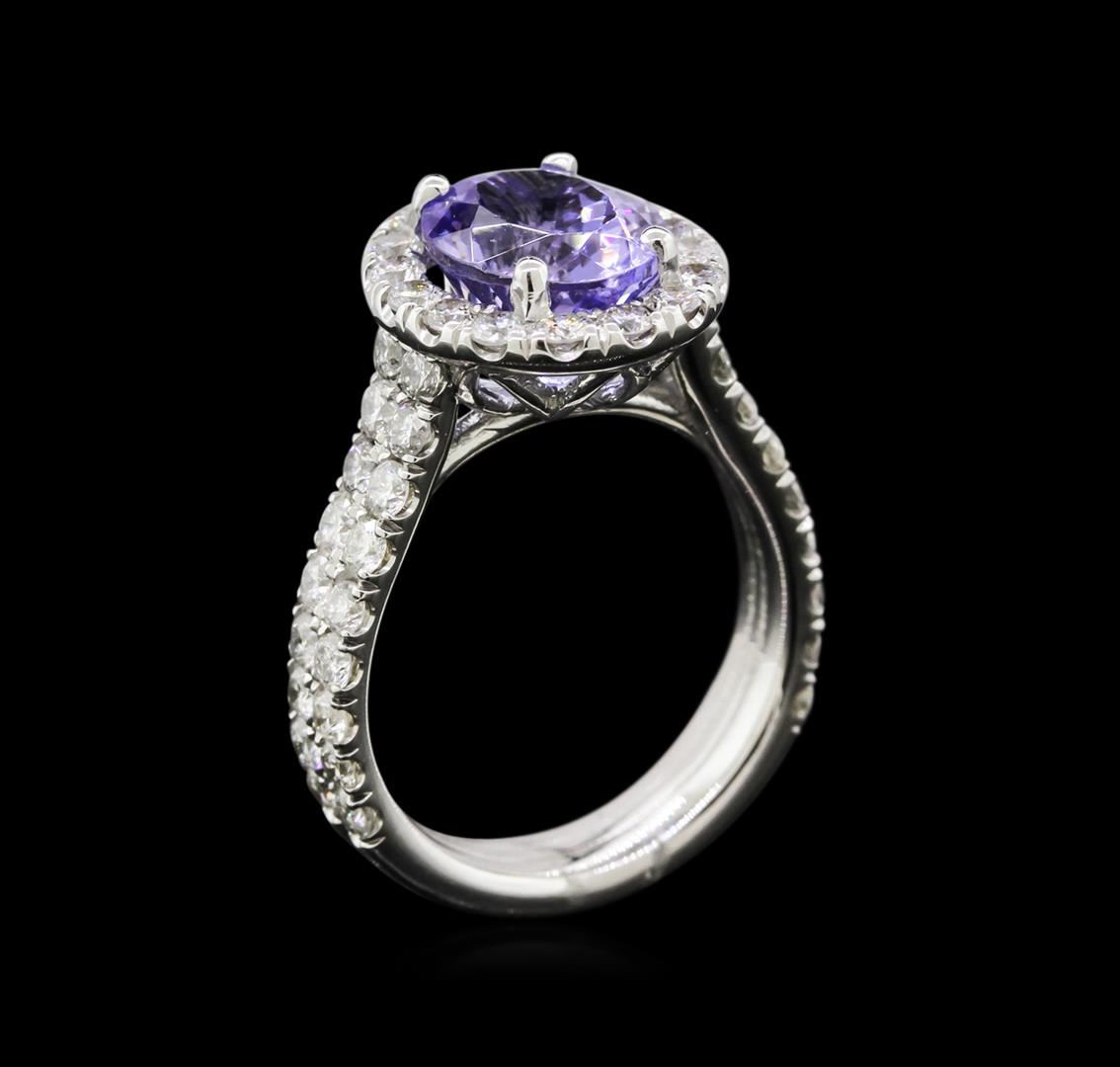 One electronically tested 14KT white gold lady's cast fashion ring with a basket halo with a bright polish finish. The featured lady's ring has a shank measuring 4.23 millimeters wide. Condition is new, good workmanship. Containing: One prong set oval modified brilliant cut natural tanzanite, measuring 10.00 x 8.07 x 6.60mm, approximate weight of 3.57ct., clarity is eye clean, type I, light, very slightly grayish, bluish violet color, (GIA bV 3/3), cut is very good. Transmitting light with no distortion, transparent. Colored gemstones are presumed to have been subjected to commonly used enhancement processes. Graded in the setting. Fifty-Two prong set round brilliant cut diamonds, measuring 2.00 - 1.95 x 1.29mm (depth est.) approximate total weight of 52 Stones = 1.60ct. Graded in the setting. Clarity: SI-1 to I-1. Color: H - I. Cut Very Good. Total Weight of Colored Stones 3.57ct. Total Weight of Diamonds 1.60ct. Total Weight of Ring 6.30gm. GAS Appraised at $6,960.00.