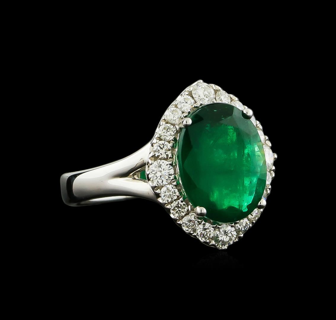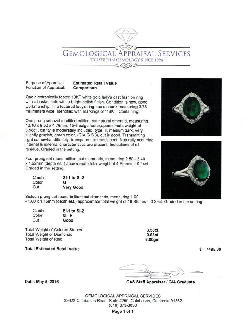 One electronically tested 18KT white gold lady's cast fashion ring with a basket halo with a bright polish finish. The featured lady's ring has a shank measuring 3.78 millimeters wide. Identified with markings of "18K". Condition is new, good workmanship. Containing: One prong set oval modified brilliant cut natural emerald, measuring 12.16 x 9.52 x 4.76mm, 15%. bulge factor, approximate weight of 3.58ct., clarity is moderately included, type III, medium dark, very slightly grayish, green color, (GIA G 6/3), cut is good. Transmitting light somewhat diffusely, transparent to translucent. Naturally occurring internal & external characteristics are present. Indications of oil residue. Graded in the setting. Four prong set round brilliant cut diamonds, measuring 2.50 - 2.40 x 1.52mm (depth est.) approximate total weight of 4 Stones = 0.24ct. Graded in the setting. Clarity: SI-1 to SI-2. Color: Very Good Sixteen prong set round brilliant cut diamonds, measuring 1.90 - 1.80 x 1.15mm (depth est.) approximate total weight of 16 Stones = 0.39ct. Graded in the setting. Clarity: SI-1 to SI-2. Color: G - Good. Total Weight of Colored Stones 3.58ct. Total Weight of Diamonds 0.63ct. Total Weight of Ring 6.80gm GAS Appraised at $7,495.00.