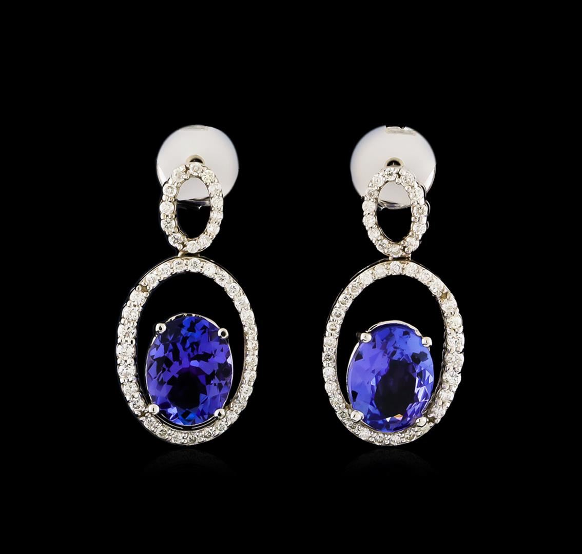 One pair electronically tested 14KT white gold lady's combination cast & assembled dangle earrings with friction posts with a bright polish finish. The featured pair of lady's earrings has a drop of approximately 25 millimeters. Identified with markings of "14K". Condition is new, good workmanship. Containing: Two prong set oval modified brilliant cut natural tanzanites, measuring 9.40 x 7.48 x 3.87mm, approximate total weight of 3.58ct., clarity is eye clean, medium light, very slightly grayish, violetish blue color, (GIA vB 4/3), cut is very good. Transmitting light with no distortion, transparent. Colored gemstones are presumed to have been subjected to commonly used enhancement processes. Graded in the setting. Eight prong set round brilliant cut diamonds, measuring 1.40 - 1.35 x 0.86mm (depth est.) approximate total weight of 8 Stones = 0.08ct. Graded in the setting. Clarity: SI-1 to SI-2. Color: G - Very Good Eighty prong set round brilliant cut diamonds, measuring 1.25 - 1.15 x 0.74mm (depth est.) approximate total weight of 80 Stones = 0.54ct. Graded in the setting. Clarity: SI-1 to I-1. Color: H - I. Cut Good. Total Weight of Colored Stones 3.58ct. Total Weight of Diamonds 0.62ct. Total Weight of Earrings 5.00gm. GAS Appraised at $6,450.00.
