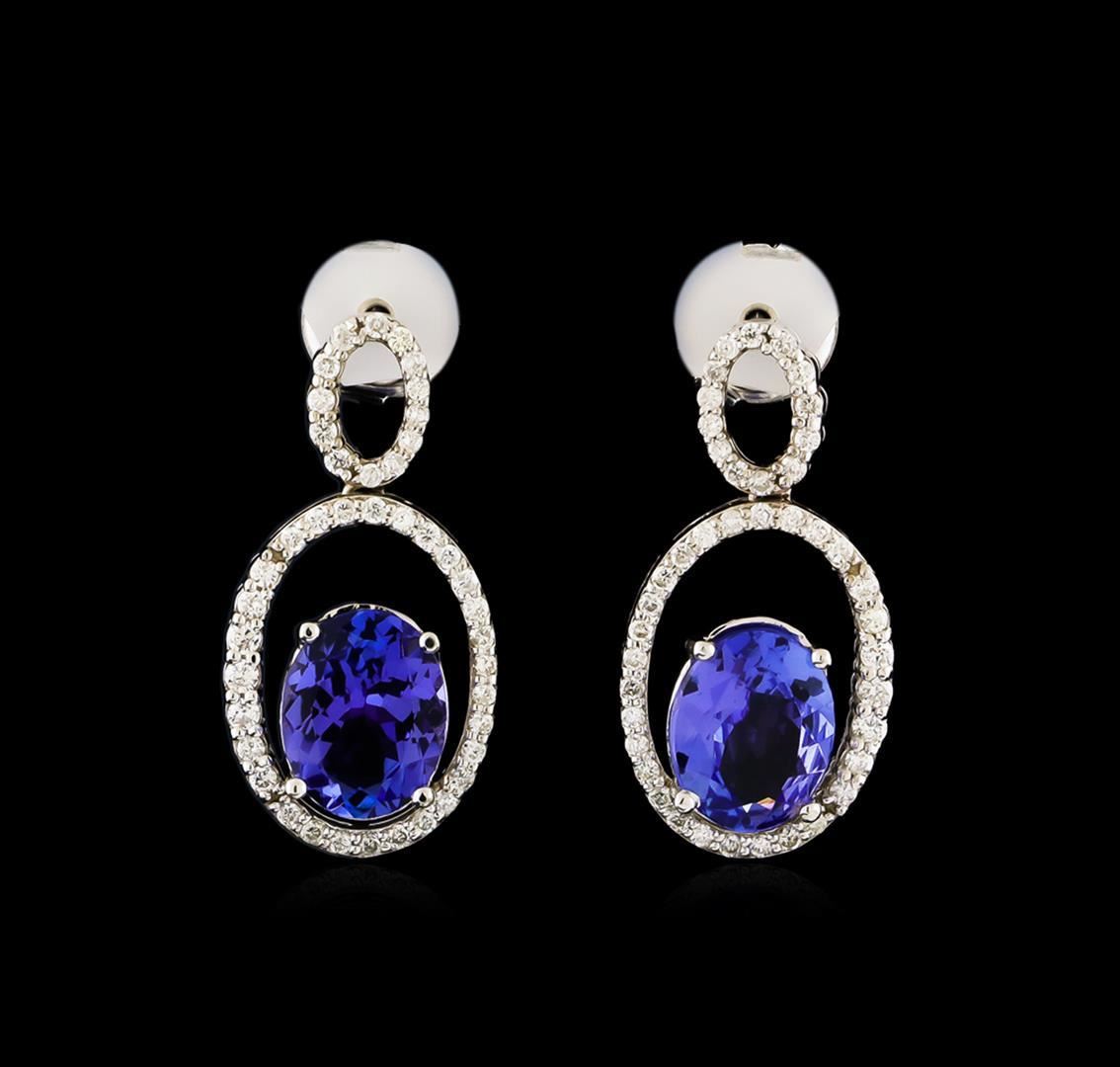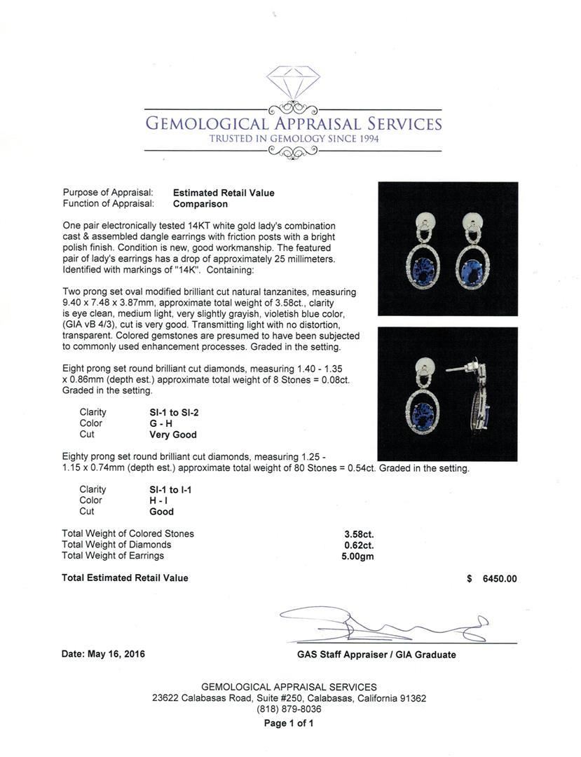 One pair electronically tested 14KT white gold lady's combination cast & assembled dangle earrings with friction posts with a bright polish finish. The featured pair of lady's earrings has a drop of approximately 25 millimeters. Identified with markings of "14K". Condition is new, good workmanship. Containing: Two prong set oval modified brilliant cut natural tanzanites, measuring 9.40 x 7.48 x 3.87mm, approximate total weight of 3.58ct., clarity is eye clean, medium light, very slightly grayish, violetish blue color, (GIA vB 4/3), cut is very good. Transmitting light with no distortion, transparent. Colored gemstones are presumed to have been subjected to commonly used enhancement processes. Graded in the setting. Eight prong set round brilliant cut diamonds, measuring 1.40 - 1.35 x 0.86mm (depth est.) approximate total weight of 8 Stones = 0.08ct. Graded in the setting. Clarity: SI-1 to SI-2. Color: G - Very Good Eighty prong set round brilliant cut diamonds, measuring 1.25 - 1.15 x 0.74mm (depth est.) approximate total weight of 80 Stones = 0.54ct. Graded in the setting. Clarity: SI-1 to I-1. Color: H - I. Cut Good. Total Weight of Colored Stones 3.58ct. Total Weight of Diamonds 0.62ct. Total Weight of Earrings 5.00gm.