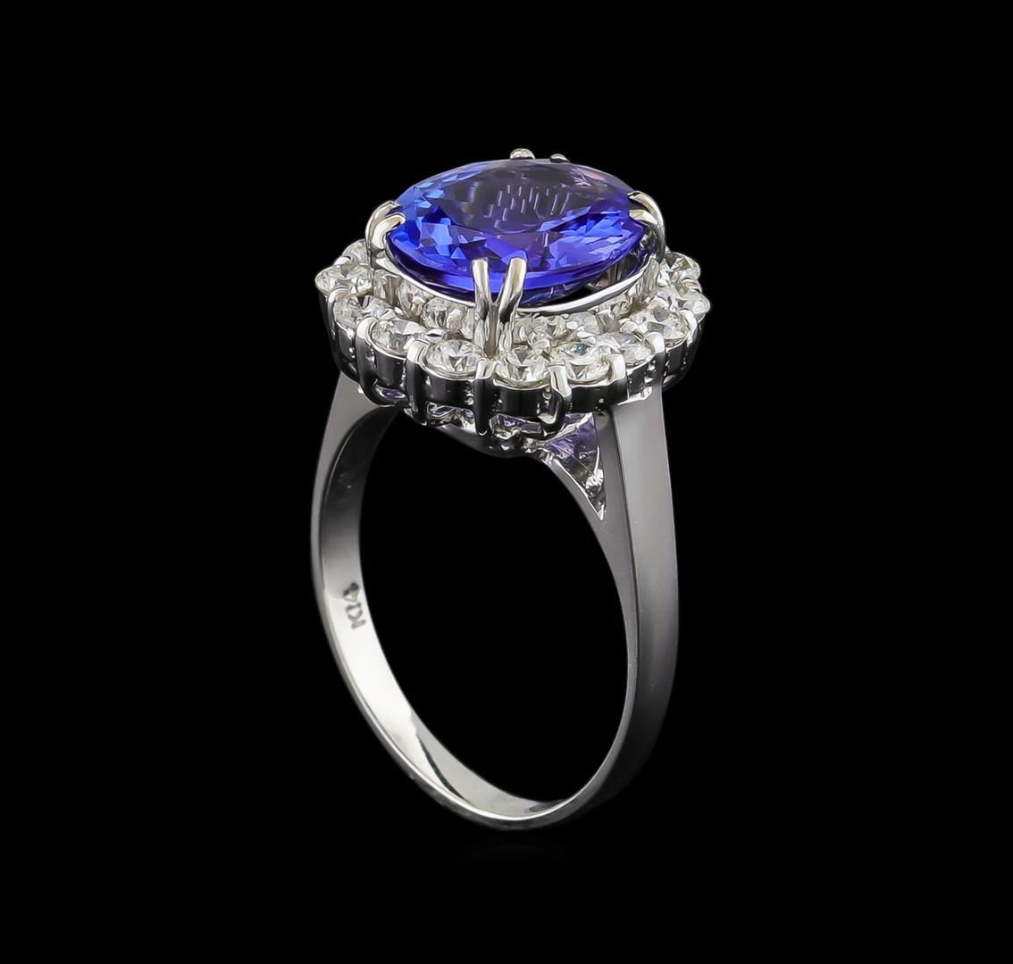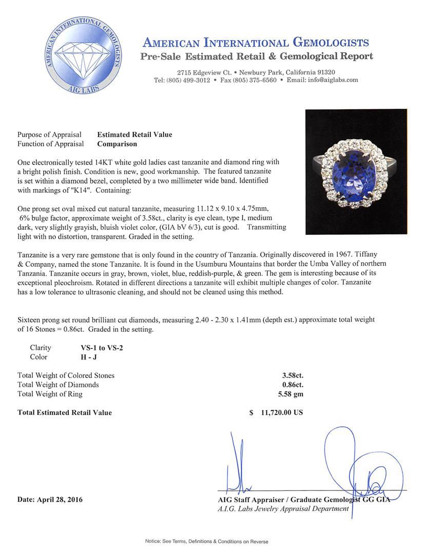 One electronically tested 14KT white gold ladies cast tanzanite and diamond ring with a bright polish finish. The featured tanzanite is set within a diamond bezel, completed by a two millimeter wide band. Identified with markings of "K14". Condition is new, good workmanship. Containing: One prong set oval mixed cut natural tanzanite, measuring 11.12 x 9.10 x 4.75mm, 6%. bulge factor, approximate weight of 3.58ct., clarity is eye clean, type I, medium dark, very slightly grayish, bluish violet color, (GIA bV 6/3), cut is good. Transmitting light with no distortion, transparent. Graded in the setting. Tanzanite is a very rare gemstone that is only found in the country of Tanzania. Originally discovered in 1967. Tiffany & Company, named the stone Tanzanite. It is found in the Usumburu Mountains that border the Umba Valley of northern Tanzania. Tanzanite occurs in gray, brown, violet, blue, reddish-purple, & green. The gem is interesting because of its exceptional pleochroism. Rotated in different directions a tanzanite will exhibit multiple changes of color. Tanzanite has a low tolerance to ultrasonic cleaning, and should not be cleaned using this method. Sixteen prong set round brilliant cut diamonds, measuring 2.40 - 2.30 x 1.41mm (depth est.) approximate total weight of 16 Stones = 0.86ct. Graded in the setting. Clarity: VS-1 to VS-2. Color: H - J. Total Weight of Colored Stones 3.58ct. Total Weight of Diamonds 0.86ct. Total Weight of Ring 5.58gm. AIG Appraised at $11,720.00.
