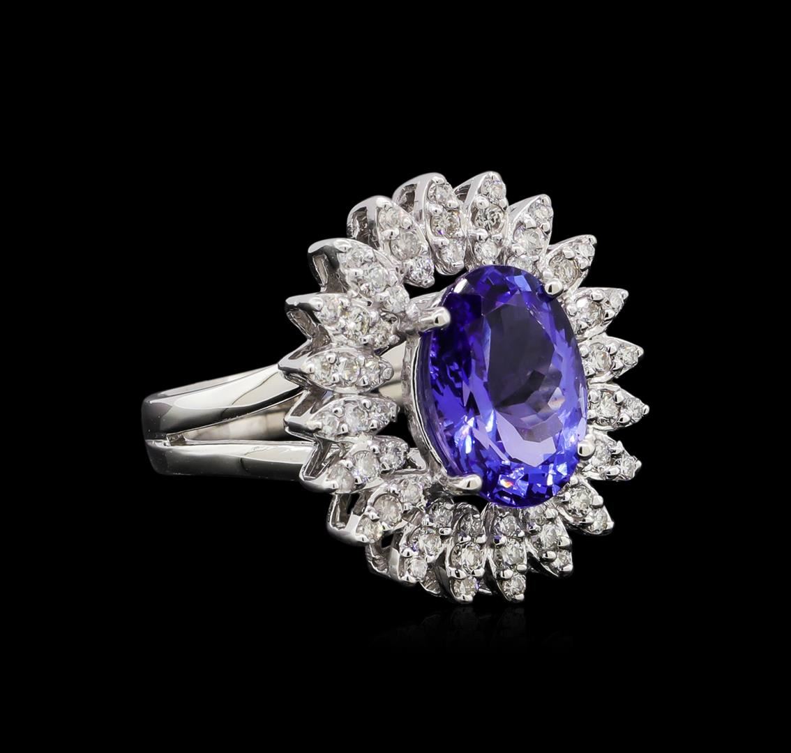 One electronically tested 14KT white gold lady's cast fashion ring with a triple basket halo with a bright polish finish. The featured lady's ring has a shank measuring 3.45 millimeters in width. Identified with markings of 'K14'. Condition is new, good workmanship. Containing: One prong set oval modified brilliant cut natural tanzanite, measuring 11.30 x 8.03 x 5.61mm, (depth est.) approximate weight of 3.58ct., clarity is eye clean, medium, moderately strong, bluish violet color, (GIA bV 5/4), cut is good. Transmitting light with no distortion, transparent. Colored gemstones are presumed to have been subjected to commonly used enhancement processes. Graded in the setting. Twenty prong set round brilliant cut diamonds, measuring 1.65 - 1.60 x 1.01mm (depth est.) approximate total weight of 20 Stones = 0.32ct. Graded in the setting. Clarity SI-1 to I-1. Color: H - I Cut Good Forty prong set round brilliant cut diamonds, measuring 1.35 - 1.30 x 0.80mm (depth est.) approximate total weight of 40 Stones = 0.34ct. Graded in the setting. Clarity SI-1 to SI-2. Color: H - I Cut Good. Total Weight of Colored Stones 3.58ct.. Total Weight of Diamonds 0.66ct.. Total Weight of Ring 7.60gm. GAS Appraised at $8,475.00.