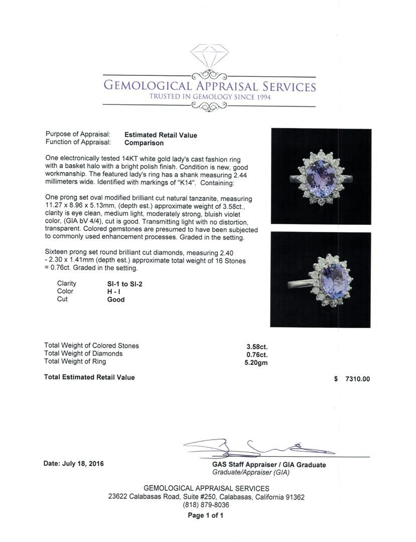 One electronically tested 14KT white gold lady's cast fashion ring with a basket halo with a bright polish finish. The featured lady's ring has a shank measuring 2.44 millimeters wide. Identified with markings of 'K14'. Condition is new, good workmanship. Containing: One prong set oval modified brilliant cut natural tanzanite, measuring 11.27 x 8.96 x 5.13mm, (depth est.) approximate weight of 3.58ct., clarity is eye clean, medium light, moderately strong, bluish violet color, (GIA bV 4/4), cut is good. Transmitting light with no distortion, transparent. Colored gemstones are presumed to have been subjected to commonly used enhancement processes. Graded in the setting. Sixteen prong set round brilliant cut diamonds, measuring 2.40 - 2.30 x 1.41mm (depth est.) approximate total weight of 16 Stones = 0.76ct. Graded in the setting. Clarity SI-1 to SI-2. Color: H - I Cut Good. Total Weight of Colored Stones 3.58ct.. Total Weight of Diamonds 0.76ct.. Total Weight of Ring 5.20gm. GAS Appraised at $7,310.00.