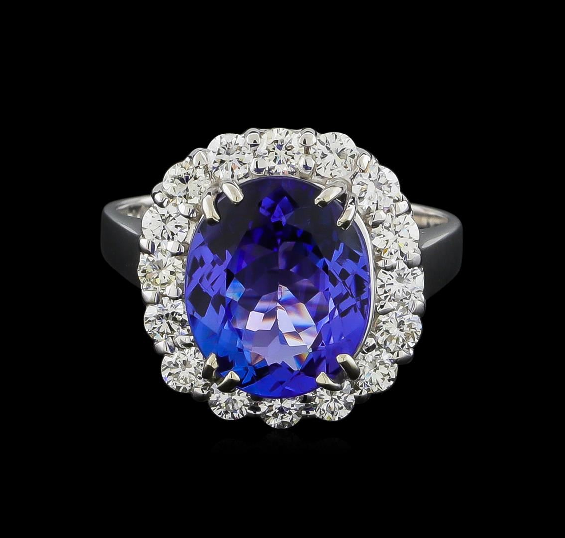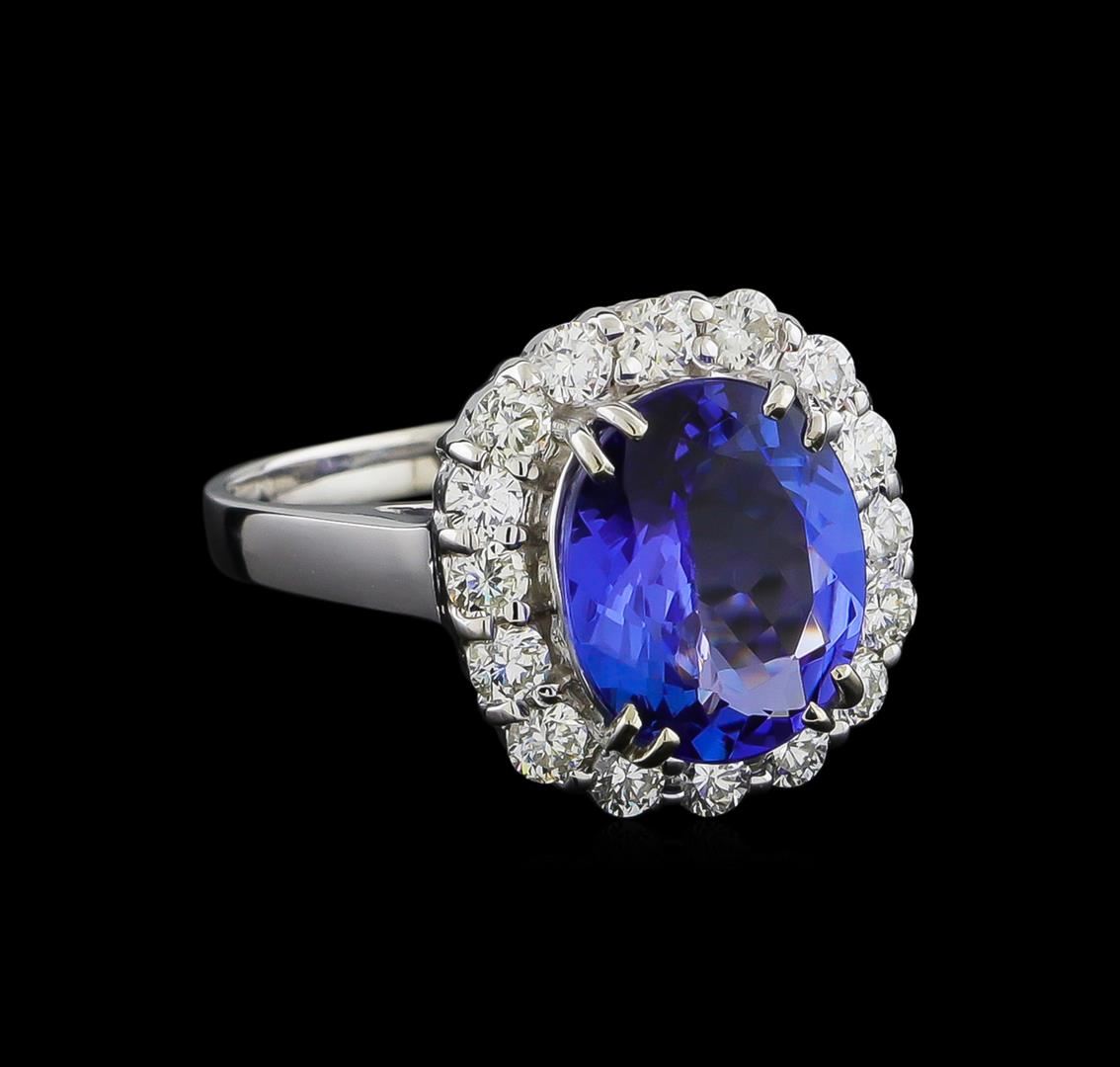 One electronically tested 14KT white gold ladies cast tanzanite and diamond ring with a bright polish finish. The featured tanzanite is set within a diamond bezel, completed by a two millimeter wide band. Identified with markings of "K14". Condition is new, good workmanship. Containing: One prong set oval mixed cut natural tanzanite, measuring 11.12 x 9.10 x 4.75mm, 6%. bulge factor, approximate weight of 3.58ct., clarity is eye clean, type I, medium dark, very slightly grayish, bluish violet color, (GIA bV 6/3), cut is good. Transmitting light with no distortion, transparent. Graded in the setting. Tanzanite is a very rare gemstone that is only found in the country of Tanzania. Originally discovered in 1967. Tiffany & Company, named the stone Tanzanite. It is found in the Usumburu Mountains that border the Umba Valley of northern Tanzania. Tanzanite occurs in gray, brown, violet, blue, reddish-purple, & green. The gem is interesting because of its exceptional pleochroism. Rotated in different directions a tanzanite will exhibit multiple changes of color. Tanzanite has a low tolerance to ultrasonic cleaning, and should not be cleaned using this method. Sixteen prong set round brilliant cut diamonds, measuring 2.40 - 2.30 x 1.41mm (depth est.) approximate total weight of 16 Stones = 0.86ct. Graded in the setting. Clarity: VS-1 to VS-2. Color: H - J. Total Weight of Colored Stones 3.58ct. Total Weight of Diamonds 0.86ct. Total Weight of Ring 5.58gm. AIG Appraised at $11,720.00.