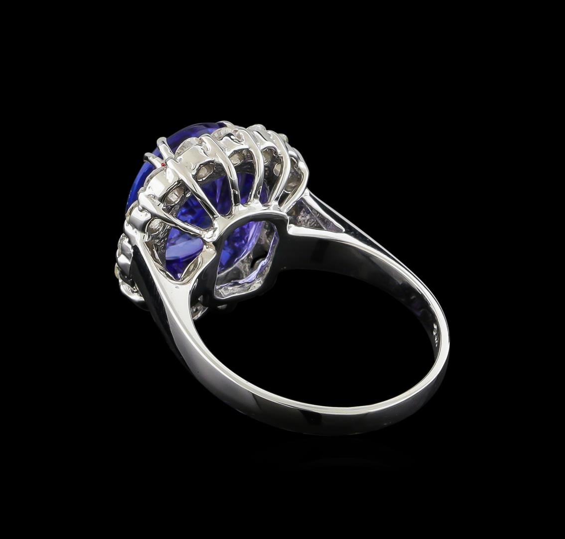 One electronically tested 14KT white gold ladies cast tanzanite and diamond ring with a bright polish finish. The featured tanzanite is set within a diamond bezel, completed by a two millimeter wide band. Identified with markings of "K14". Condition is new, good workmanship. Containing: One prong set oval mixed cut natural tanzanite, measuring 11.12 x 9.10 x 4.75mm, 6%. bulge factor, approximate weight of 3.58ct., clarity is eye clean, type I, medium dark, very slightly grayish, bluish violet color, (GIA bV 6/3), cut is good. Transmitting light with no distortion, transparent. Graded in the setting. Tanzanite is a very rare gemstone that is only found in the country of Tanzania. Originally discovered in 1967. Tiffany & Company, named the stone Tanzanite. It is found in the Usumburu Mountains that border the Umba Valley of northern Tanzania. Tanzanite occurs in gray, brown, violet, blue, reddish-purple, & green. The gem is interesting because of its exceptional pleochroism. Rotated in different directions a tanzanite will exhibit multiple changes of color. Tanzanite has a low tolerance to ultrasonic cleaning, and should not be cleaned using this method. Sixteen prong set round brilliant cut diamonds, measuring 2.40 - 2.30 x 1.41mm (depth est.) approximate total weight of 16 Stones = 0.86ct. Graded in the setting. Clarity: VS-1 to VS-2. Color: H - J. Total Weight of Colored Stones 3.58ct. Total Weight of Diamonds 0.86ct. Total Weight of Ring 5.58gm. AIG Appraised at $11,720.00.