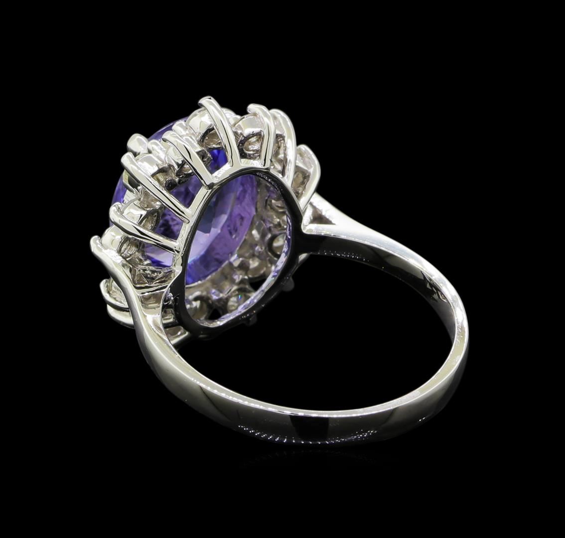 One electronically tested 14KT white gold lady's cast fashion ring with a basket halo with a bright polish finish. The featured lady's ring has a shank measuring 2.44 millimeters wide. Identified with markings of 'K14'. Condition is new, good workmanship. Containing: One prong set oval modified brilliant cut natural tanzanite, measuring 11.27 x 8.96 x 5.13mm, (depth est.) approximate weight of 3.58ct., clarity is eye clean, medium light, moderately strong, bluish violet color, (GIA bV 4/4), cut is good. Transmitting light with no distortion, transparent. Colored gemstones are presumed to have been subjected to commonly used enhancement processes. Graded in the setting. Sixteen prong set round brilliant cut diamonds, measuring 2.40 - 2.30 x 1.41mm (depth est.) approximate total weight of 16 Stones = 0.76ct. Graded in the setting. Clarity SI-1 to SI-2. Color: H - I Cut Good. Total Weight of Colored Stones 3.58ct.. Total Weight of Diamonds 0.76ct.. Total Weight of Ring 5.20gm. GAS Appraised at $7,310.00.