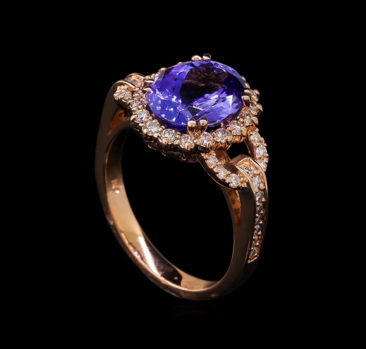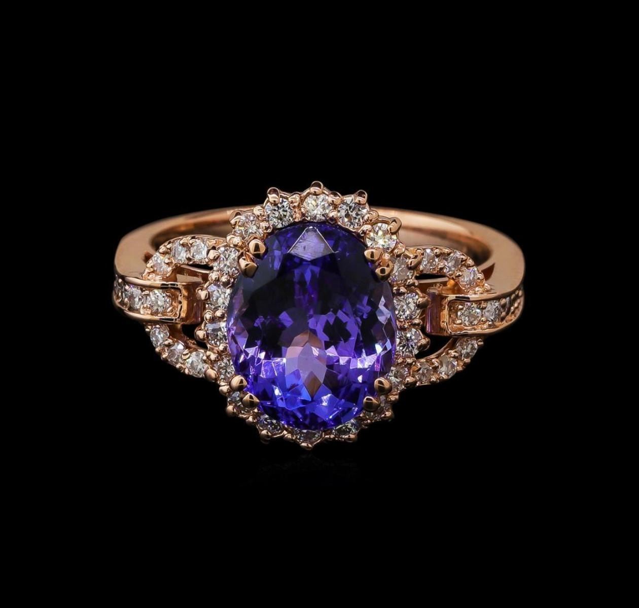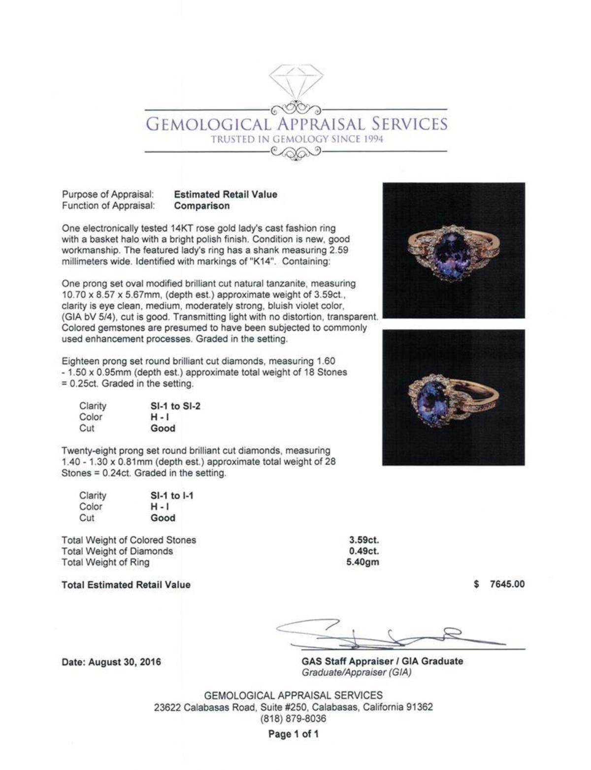 One electronically tested 14KT rose gold lady's cast fashion ring with a basket halo with a bright polish finish. The featured lady's ring has a shank measuring 2.59 millimeters wide. Identified with markings of 'K14'. Condition is new, good workmanship. Containing: One prong set oval modified brilliant cut natural tanzanite, measuring 10.70 x 8.57 x 5.67mm, (depth est.) approximate weight of 3.59ct., clarity is eye clean, medium, moderately strong, bluish violet color, (GIA bV 5/4), cut is good. Transmitting light with no distortion, transparent. Colored gemstones are presumed to have been subjected to commonly used enhancement processes. Graded in the setting. Eighteen prong set round brilliant cut diamonds, measuring 1.60 - 1.50 x 0.95mm (depth est.) approximate total weight of 18 Stones = 0.25ct. Graded in the setting. Clarity SI-1 to SI-2. Color: H - I Cut Good Twenty-Eight prong set round brilliant cut diamonds, measuring 1.40 - 1.30 x 0.81mm (depth est.) approximate total weight of 28 Stones = 0.24ct. Graded in the setting. Clarity SI-1 to I-1. Color: H - I Cut Good. Total Weight of Colored Stones 3.59ct. Total Weight of Diamonds 0.49ct. Total Weight of Ring 5.40gm.