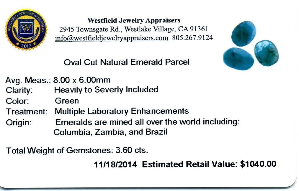3.60cts. Oval Cut Natural Emerald Parcel Westfield Appraised at $1,040.00.