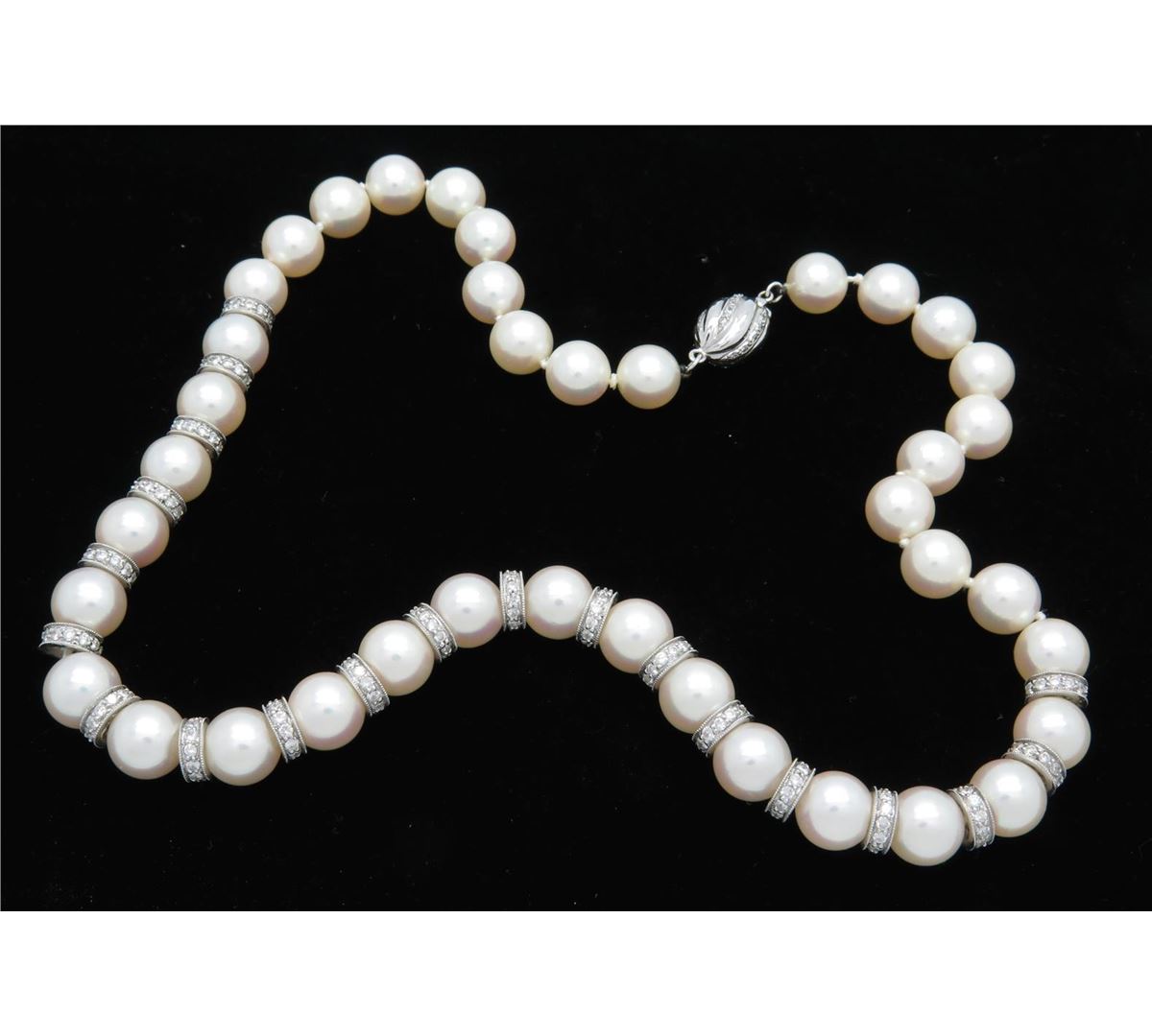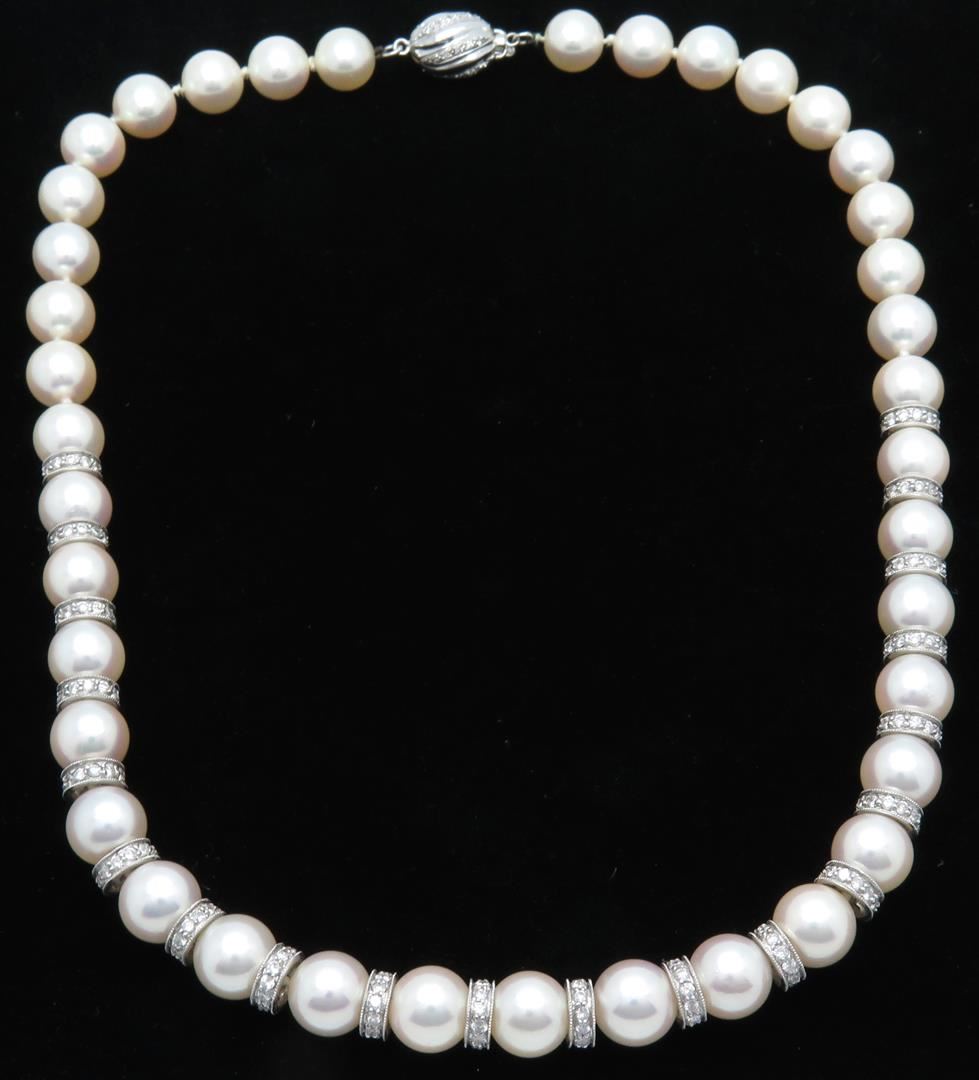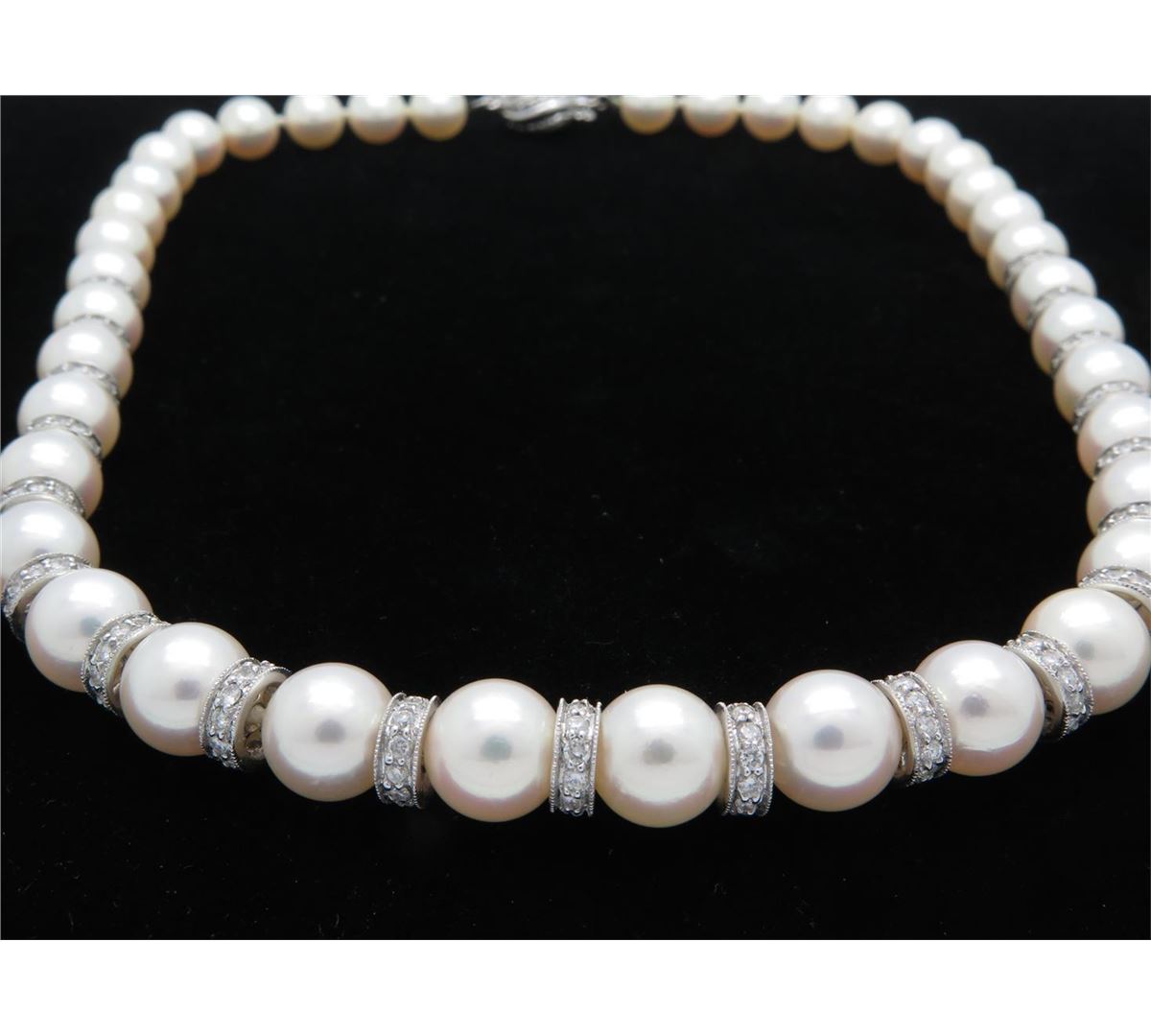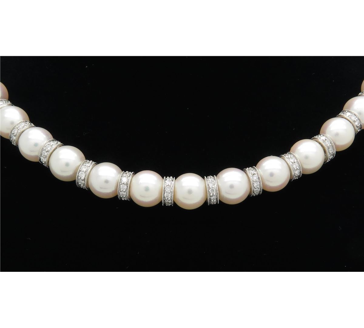 One tested 14K white gold pearl and diamond necklace. Containing: 39 8.5MM Pearls, 240 Round Brilliant Cut Diamonds. Clarity: VS-SI, Color: F-H. Approximate total diamond weight: 3.60CTW. All diamonds are graded in the mounting unless otherwise stated. Weight of necklace: 53.5 grams, Size: 16.25" long.