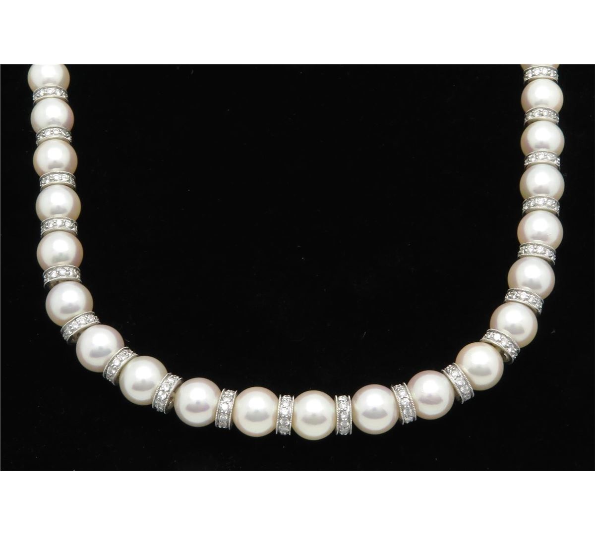 One tested 14K white gold pearl and diamond necklace. Containing: 39 8.5MM Pearls, 240 Round Brilliant Cut Diamonds. Clarity: VS-SI, Color: F-H. Approximate total diamond weight: 3.60CTW. All diamonds are graded in the mounting unless otherwise stated. Weight of necklace: 53.5 grams, Size: 16.25" long.