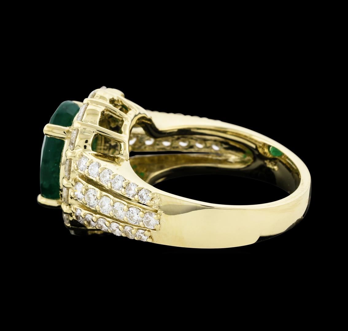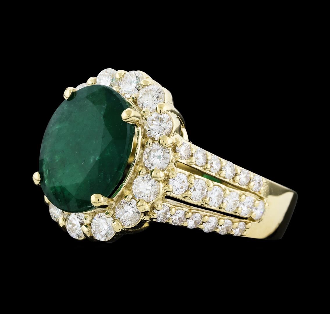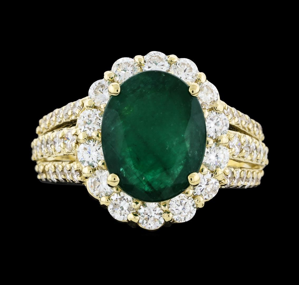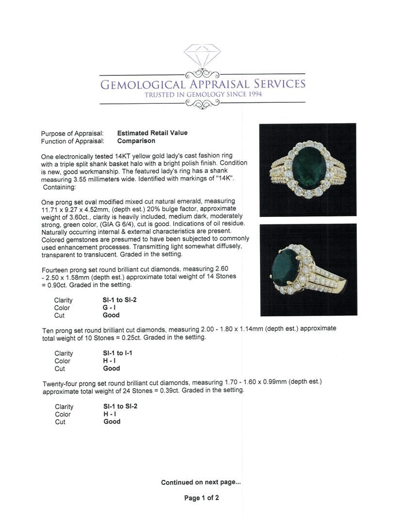 One electronically tested 14KT yellow gold lady's cast fashion ring with a triple split shank basket halo with a bright polish finish. The featured lady's ring has a shank measuring 3.55 millimeters wide. Identified with markings of '14K'. Condition is new, good workmanship. Containing: One prong set oval modified mixed cut natural emerald, measuring 11.71 x 9.27 x 4.52mm, (depth est.) 20%. bulge factor, approximate weight of 3.60ct., clarity is heavily included, medium dark, moderately strong, green color, (GIA G 6/4), cut is good. Indications of oil residue. Naturally occurring internal & external characteristics are present. Colored gemstones are presumed to have been subjected to commonly used enhancement processes. Transmitting light somewhat diffusely, transparent to translucent. Graded in the setting. Fourteen prong set round brilliant cut diamonds, measuring 2.60 - 2.50 x 1.58mm (depth est.) approximate total weight of 14 Stones = 0.90ct. Graded in the setting. Clarity SI-1 to SI-2. Color: G - I Cut Good Ten prong set round brilliant cut diamonds, measuring 2.00 - 1.80 x 1.14mm (depth est.) approximate total weight of 10 Stones = 0.25ct. Graded in the setting. Clarity SI-1 to I-1. Color: H - I Cut Good Twenty-Four prong set round brilliant cut diamonds, measuring 1.70 - 1.60 x 0.99mm (depth est.) approximate total weight of 24 Stones = 0.39ct. Graded in the setting. Clarity SI-1 to SI-2. Color: H - I Cut Good. Total Weight of Colored Stones 3.60ct.. Total Weight of Diamonds 1.54ct.. Total Weight of Ring 8.30gm. GAS Appraised at $7,065.00.