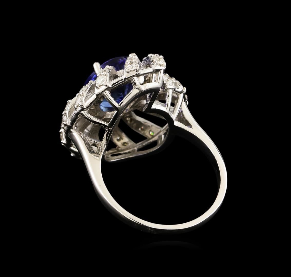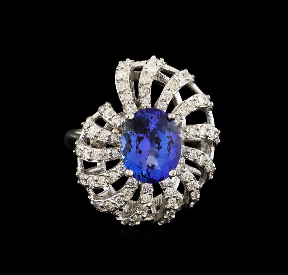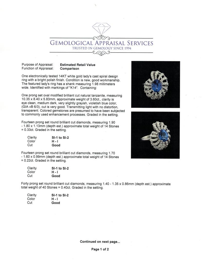 One electronically tested 14KT white gold lady's cast spiral design ring with a bright polish finish. The featured lady's ring has a shank measuring 1.98 millimeters wide. Identified with markings of "K14". Condition is new, good workmanship. Containing: One prong set oval modified brilliant cut natural tanzanite, measuring 10.35 x 8.40 x 5.83mm, approximate weight of 3.60ct., clarity is eye clean, medium dark, very slightly grayish, violetish blue color, (GIA vB 6/3), cut is very good. Transmitting light with no distortion, transparent. Colored gemstones are presumed to have been subjected to commonly used enhancement processes. Graded in the setting. Fourteen prong set round brilliant cut diamonds, measuring 1.90 - 1.80 x 1.13mm (depth est.) approximate total weight of 14 Stones = 0.33ct. Graded in the setting. Clarity: SI-1 to SI-2. Color: H - I. Cut Good Fourteen prong set round brilliant cut diamonds, measuring 1.70 - 1.60 x 0.99mm (depth est.) approximate total weight of 14 Stones = 0.22ct. Graded in the setting. Clarity: SI-1 to SI-2. Color: H - I. Cut Good Forty prong set round brilliant cut diamonds, measuring 1.40 - 1.35 x 0.86mm (depth est.) approximate total weight of 40 Stones = 0.40ct. Graded in the setting. Clarity: SI-1 to SI-2. Color: H - I. Cut Good. Total Weight of Colored Stones 3.60ct. Total Weight of Diamonds 0.95ct. Total Weight of Ring 7.80gm. GAS Appraised at $9,625.00.