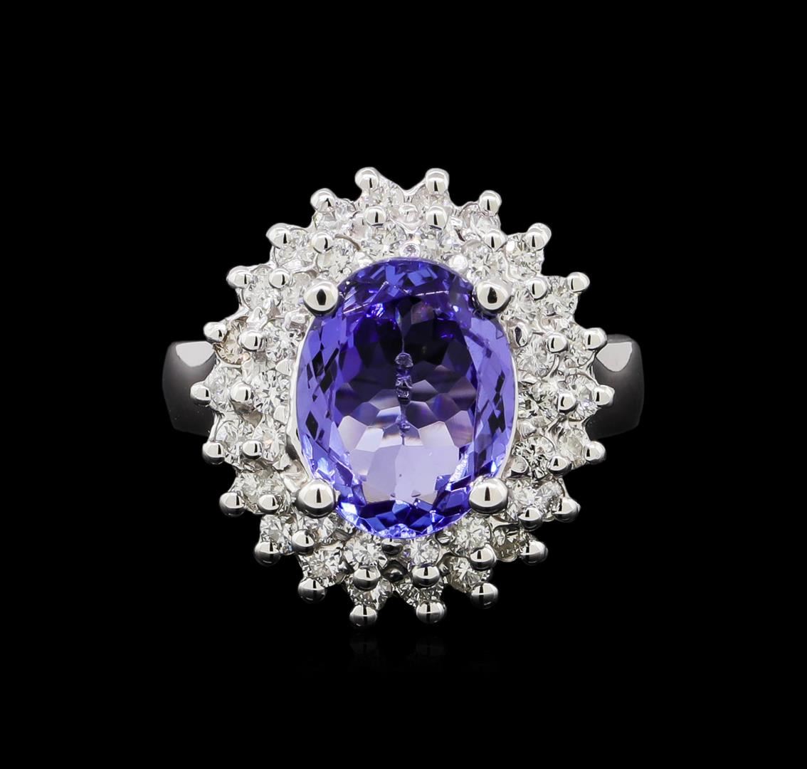 One electronically tested 14KT white gold lady's cast fashion ring with a double basket halo with a bright polish finish. The featured lady's ring has a shank measuring 3.10 millimeters in width. Identified with markings of '14K'. Condition is new, good workmanship. Containing: One prong set oval modified brilliant cut natural tanzanite, measuring 11.00 x 8.70 x 4.70mm, (depth est.) 10%. bulge factor, approximate weight of 3.60ct., clarity is eye clean, medium light, moderately strong, bluish violet color, (GIA bV 4/4), cut is very good. Transmitting light with no distortion, transparent. Colored gemstones are presumed to have been subjected to commonly used enhancement processes. Graded in the setting. Forty prong set round brilliant cut diamonds, measuring 1.80 - 1.75 x 1.10mm (depth est.) approximate total weight of 40 Stones = 0.84ct. Graded in the setting. Clarity SI-1 to SI-2. Color: H - I Cut Good. Total Weight of Colored Stones 3.60ct.. Total Weight of Diamonds 0.84ct.. Total Weight of Ring 7.00gm. GAS Appraised at $7,900.00.