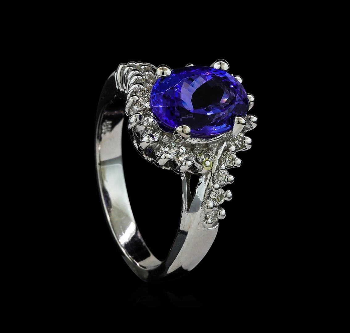 One electronically tested 14KT white gold lady's cast fashion ring with a bypass swirl halo with a bright polish finish. The featured lady's ring has a shank measuring 2.97 millimeters wide. Identified with markings of '14K'. Condition is new, good workmanship. Containing: One prong set oval modified brilliant cut natural tanzanite, measuring 10.52 x 8.19 x 6.05mm, (depth est.) approximate weight of 3.60ct., clarity is eye clean, medium dark, strong, violetish blue color, (GIA vB 6/5), cut is very good. Transmitting light with no distortion, transparent. Colored gemstones are presumed to have been subjected to commonly used enhancement processes. Graded in the setting. Twenty-Two prong set round brilliant cut diamonds, measuring 1.80 - 1.70 x 1.09mm (depth est.) approximate total weight of 22 Stones = 0.45ct. Graded in the setting. Clarity SI-1 to I-1. Color: G - H Cut Good. Total Weight of Colored Stones 3.60ct.. Total Weight of Diamonds 0.45ct.. Total Weight of Ring 7.00gm GAS Appraised at $8,415.00.