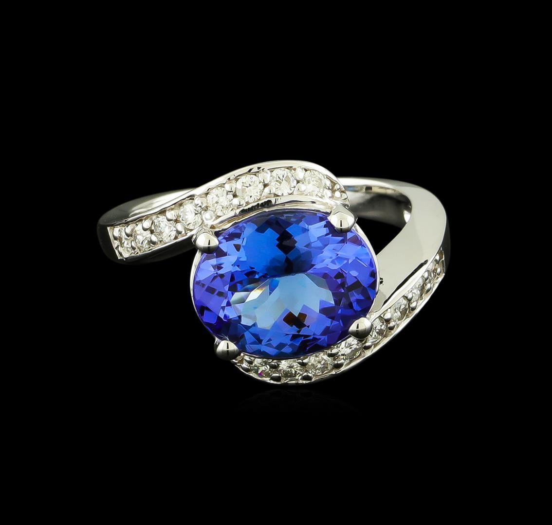 One electronically tested 14KT white gold lady's cast fashion ring with a bypass shank with a bright polish finish. The featured lady's ring has a shank measuring 2.37 millimeters wide. Identified with markings of "K14". Condition is new, good workmanship. Containing: One prong set oval modified brilliant cut natural tanzanite, measuring 11.20 x 9.15 x 5.22mm, approximate weight of 3.60ct., clarity is eye clean, type I, medium, very slightly grayish, violetish blue color, (GIA vB 5/3), cut is very good. Transmitting light with no distortion, transparent. Colored gemstones are presumed to have been subjected to commonly used enhancement processes. Graded in the setting. Sixteen prong set round brilliant cut diamonds, measuring 1.80 - 1.70 x 1.09mm (depth est.) approximate total weight of 16 Stones = 0.32ct. Graded in the setting. Clarity: SI-1 to I-1. Color: H - I. Cut Good. Total Weight of Colored Stones 3.60ct. Total Weight of Diamonds 0.32ct. Total Weight of Ring 6.40gm. GAS Appraised at $7,335.00.
