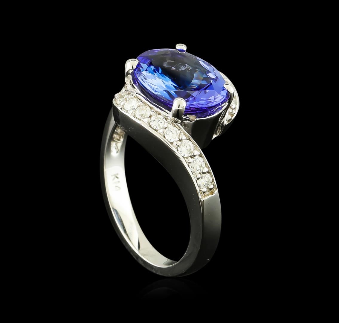One electronically tested 14KT white gold lady's cast fashion ring with a bypass shank with a bright polish finish. The featured lady's ring has a shank measuring 2.37 millimeters wide. Identified with markings of "K14". Condition is new, good workmanship. Containing: One prong set oval modified brilliant cut natural tanzanite, measuring 11.20 x 9.15 x 5.22mm, approximate weight of 3.60ct., clarity is eye clean, type I, medium, very slightly grayish, violetish blue color, (GIA vB 5/3), cut is very good. Transmitting light with no distortion, transparent. Colored gemstones are presumed to have been subjected to commonly used enhancement processes. Graded in the setting. Sixteen prong set round brilliant cut diamonds, measuring 1.80 - 1.70 x 1.09mm (depth est.) approximate total weight of 16 Stones = 0.32ct. Graded in the setting. Clarity: SI-1 to I-1. Color: H - I. Cut Good. Total Weight of Colored Stones 3.60ct. Total Weight of Diamonds 0.32ct. Total Weight of Ring 6.40gm. GAS Appraised at $7,335.00.