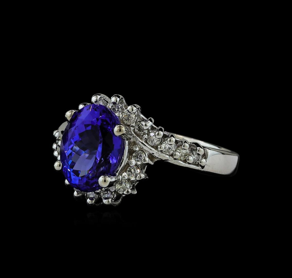 One electronically tested 14KT white gold lady's cast fashion ring with a bypass swirl halo with a bright polish finish. The featured lady's ring has a shank measuring 2.97 millimeters wide. Identified with markings of '14K'. Condition is new, good workmanship. Containing: One prong set oval modified brilliant cut natural tanzanite, measuring 10.52 x 8.19 x 6.05mm, (depth est.) approximate weight of 3.60ct., clarity is eye clean, medium dark, strong, violetish blue color, (GIA vB 6/5), cut is very good. Transmitting light with no distortion, transparent. Colored gemstones are presumed to have been subjected to commonly used enhancement processes. Graded in the setting. Twenty-Two prong set round brilliant cut diamonds, measuring 1.80 - 1.70 x 1.09mm (depth est.) approximate total weight of 22 Stones = 0.45ct. Graded in the setting. Clarity SI-1 to I-1. Color: G - H Cut Good. Total Weight of Colored Stones 3.60ct.. Total Weight of Diamonds 0.45ct.. Total Weight of Ring 7.00gm GAS Appraised at $8,415.00.
