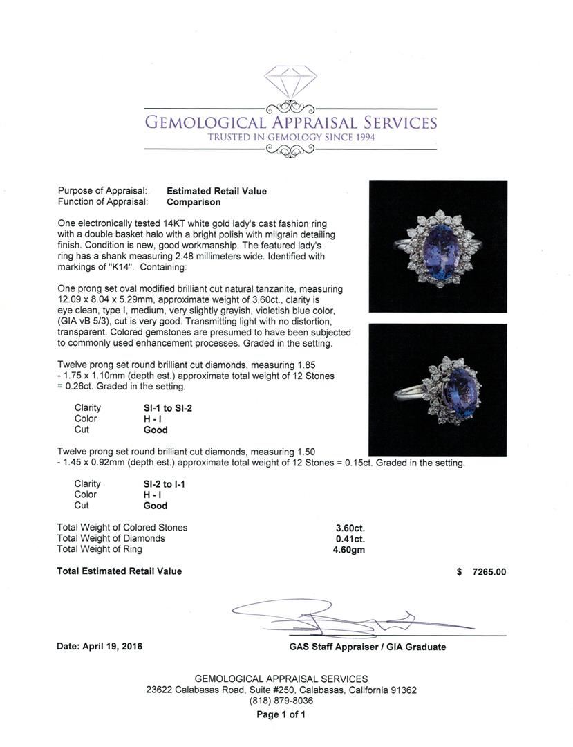 One electronically tested 14KT white gold lady's cast fashion ring with a double basket halo with a bright polish with milgrain detailing finish. The featured lady's ring has a shank measuring 2.48 millimeters wide. Identified with markings of "K14". Condition is new, good workmanship. Containing: One prong set oval modified brilliant cut natural tanzanite, measuring 12.09 x 8.04 x 5.29mm, approximate weight of 3.60ct., clarity is eye clean, type I, medium, very slightly grayish, violetish blue color, (GIA vB 5/3), cut is very good. Transmitting light with no distortion, transparent. Colored gemstones are presumed to have been subjected to commonly used enhancement processes. Graded in the setting. Twelve prong set round brilliant cut diamonds, measuring 1.85 - 1.75 x 1.10mm (depth est.) approximate total weight of 12 Stones = 0.26ct. Graded in the setting. Clarity: SI-1 to SI-2. Color: H - I. Cut Good Twelve prong set round brilliant cut diamonds, measuring 1.50 - 1.45 x 0.92mm (depth est.) approximate total weight of 12 Stones = 0.15ct. Graded in the setting. Clarity: SI-2 to I-1. Color: H - I. Cut Good. Total Weight of Colored Stones 3.60ct. Total Weight of Diamonds 0.41ct. Total Weight of Ring 4.60gm. GAS Appraised at $7,265.00.
