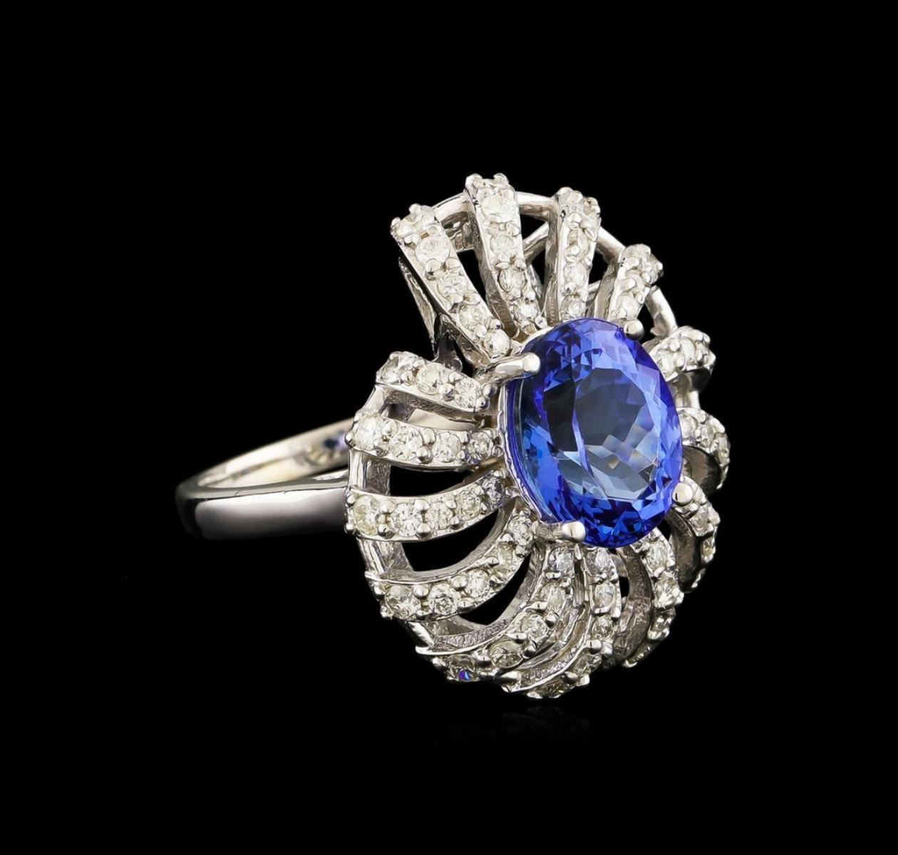 One electronically tested 14KT white gold lady's cast spiral design ring with a bright polish finish. The featured lady's ring has a shank measuring 1.98 millimeters wide. Identified with markings of "K14". Condition is new, good workmanship. Containing: One prong set oval modified brilliant cut natural tanzanite, measuring 10.35 x 8.40 x 5.83mm, approximate weight of 3.60ct., clarity is eye clean, medium dark, very slightly grayish, violetish blue color, (GIA vB 6/3), cut is very good. Transmitting light with no distortion, transparent. Colored gemstones are presumed to have been subjected to commonly used enhancement processes. Graded in the setting. Fourteen prong set round brilliant cut diamonds, measuring 1.90 - 1.80 x 1.13mm (depth est.) approximate total weight of 14 Stones = 0.33ct. Graded in the setting. Clarity: SI-1 to SI-2. Color: H - I. Cut Good Fourteen prong set round brilliant cut diamonds, measuring 1.70 - 1.60 x 0.99mm (depth est.) approximate total weight of 14 Stones = 0.22ct. Graded in the setting. Clarity: SI-1 to SI-2. Color: H - I. Cut Good Forty prong set round brilliant cut diamonds, measuring 1.40 - 1.35 x 0.86mm (depth est.) approximate total weight of 40 Stones = 0.40ct. Graded in the setting. Clarity: SI-1 to SI-2. Color: H - I. Cut Good. Total Weight of Colored Stones 3.60ct. Total Weight of Diamonds 0.95ct. Total Weight of Ring 7.80gm. GAS Appraised.