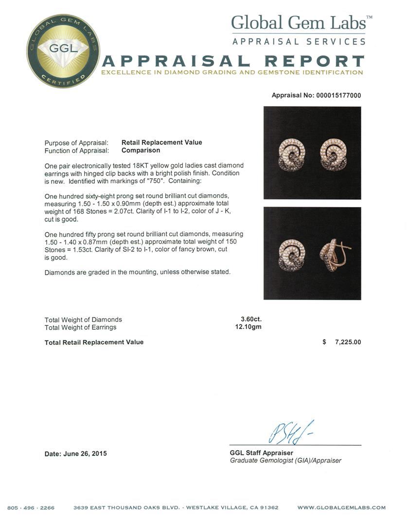 One pair electronically tested 18KT yellow gold ladies cast diamond earrings with hinged clip backs with a bright polish finish. Identified with markings of "750". Condition is new. Containing: One Hundred Sixty-Eight prong set round brilliant cut diamonds, measuring 1.50 - 1.50 x 0.90mm (depth est.) approximate total weight of 168 Stones = 2.07ct. Clarity: I-1 to I-2. Color: J - K, Cut is Good. One Hundred Fifty prong set round brilliant cut diamonds, measuring 1.50 - 1.40 x 0.87mm (depth est.) approximate total weight of 150 Stones = 1.53ct. Clarity: SI-2 to I-1, color of fancy brown, cut is Good. Diamonds are graded in the mounting, unless otherwise stated. Total Weight of Diamonds 3.60ct. Total Weight of Earrings 12.10 grams. GGL Appraised at $7,225.00.