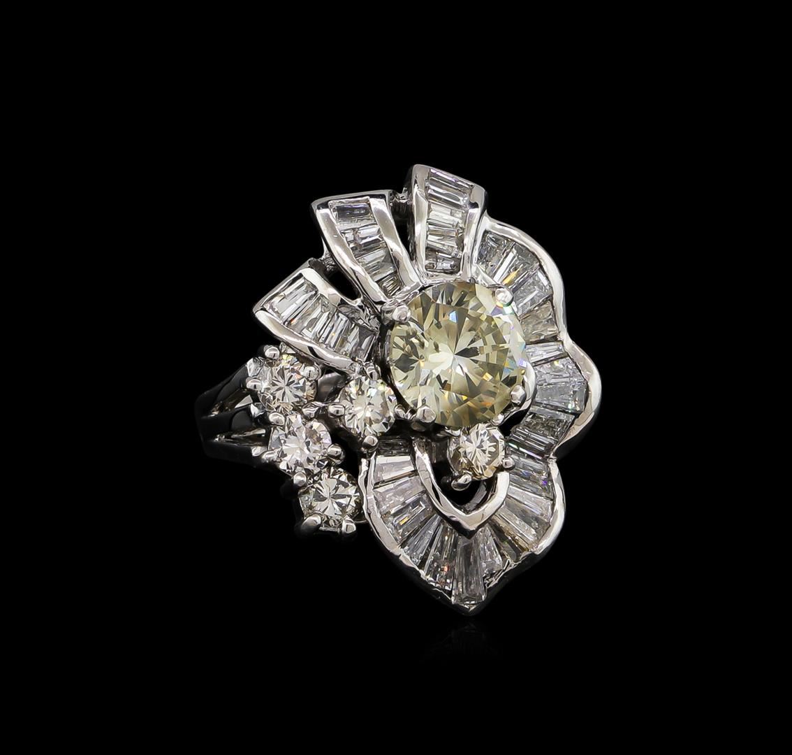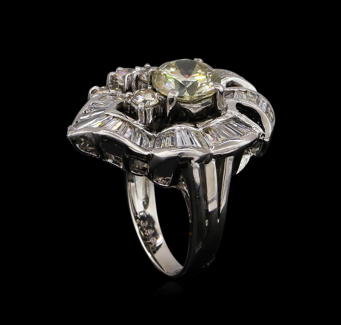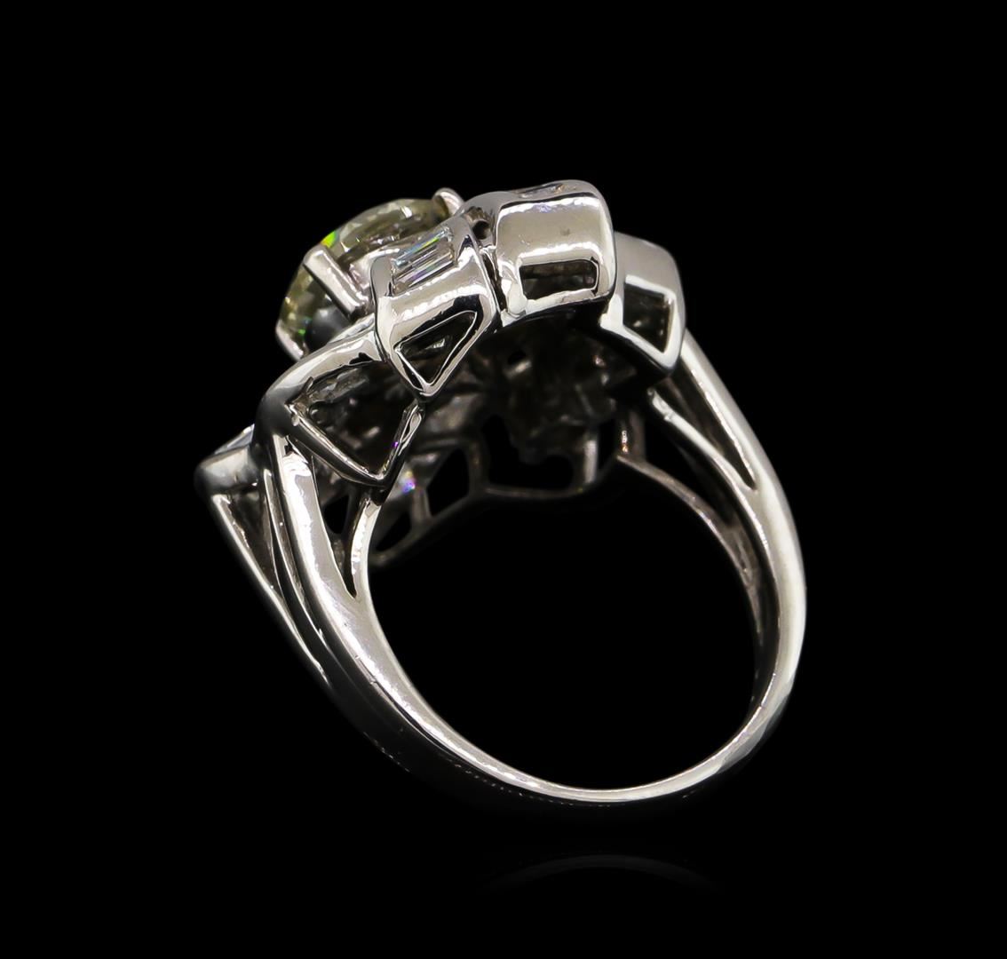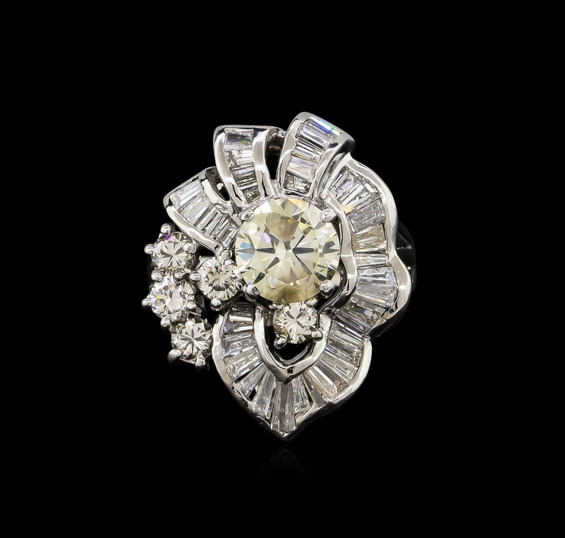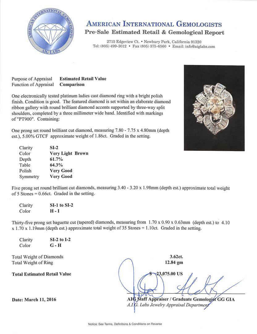One electronically tested platinum ladies cast diamond ring with a bright polish finish. The featured diamond is set within an elaborate diamond ribbon gallery with round brilliant diamond accents supported by three-way split shoulders, completed by a three millimeter wide band. Identified with markings of "PT900". Condition is good. Containing: One prong set round brilliant cut diamond, measuring 7.80 - 7.75 x 4.80mm (depth est.), 5.00.%. GTCF approximate weight of 1.86ct. Graded in the setting. Clarity: SI-2. Depth: 61.7%. Table 64.3%. Five prong set round brilliant cut diamonds, measuring 3.40 - 3.20 x 1.98mm (depth est.) approximate total weight of 5 Stones = 0.66ct. Graded in the setting. Clarity: SI-1 to SI-2. Color: H - I Thirty-Five prong set baguette cut (tapered) diamonds, measuring from 1.70 x 0.90 x 0.63mm (depth est.) to 4.10 x 1.70 x 1.19mm (depth est.) approximate total weight of 35 Stones = 1.10ct. Graded in the setting. Clarity: SI-2 to I-2. Color: G - H. Total Weight of Diamonds 3.62ct. Total Weight of Ring 12.84gm. AIG Appraised at $23,075.00.