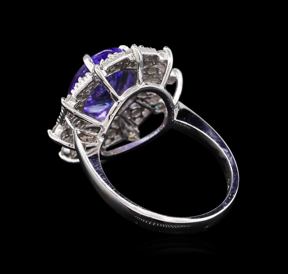 One electronically tested 14KT white gold lady's cast fashion ring with a double basket halo with a bright polish finish. The featured lady's ring has a shank measuring 2.63 millimeters wide. Identified with markings of "K14". Condition is new, good workmanship. Containing: One prong set oval modified brilliant cut natural tanzanite, measuring 11.63 x 8.81 x 5.17mm, approximate weight of 3.62ct., clarity is eye clean, type I, medium light, moderately strong, violetish blue color, (GIA vB 4/4), cut is good. Transmitting light with no distortion, transparent. Colored gemstones are presumed to have been subjected to commonly used enhancement processes. Graded in the setting. Twenty prong set round brilliant cut diamonds, measuring 2.00 - 1.90 x 1.19mm (depth est.) approximate total weight of 20 Stones = 0.55ct. Graded in the setting. Clarity: VS-2 to SI-2. Color: H - I. Cut Good. Total Weight of Colored Stones 3.62ct. Total Weight of Diamonds 0.55ct. Total Weight of Ring 6.30gm. GAS Appraised at $6,470.00.