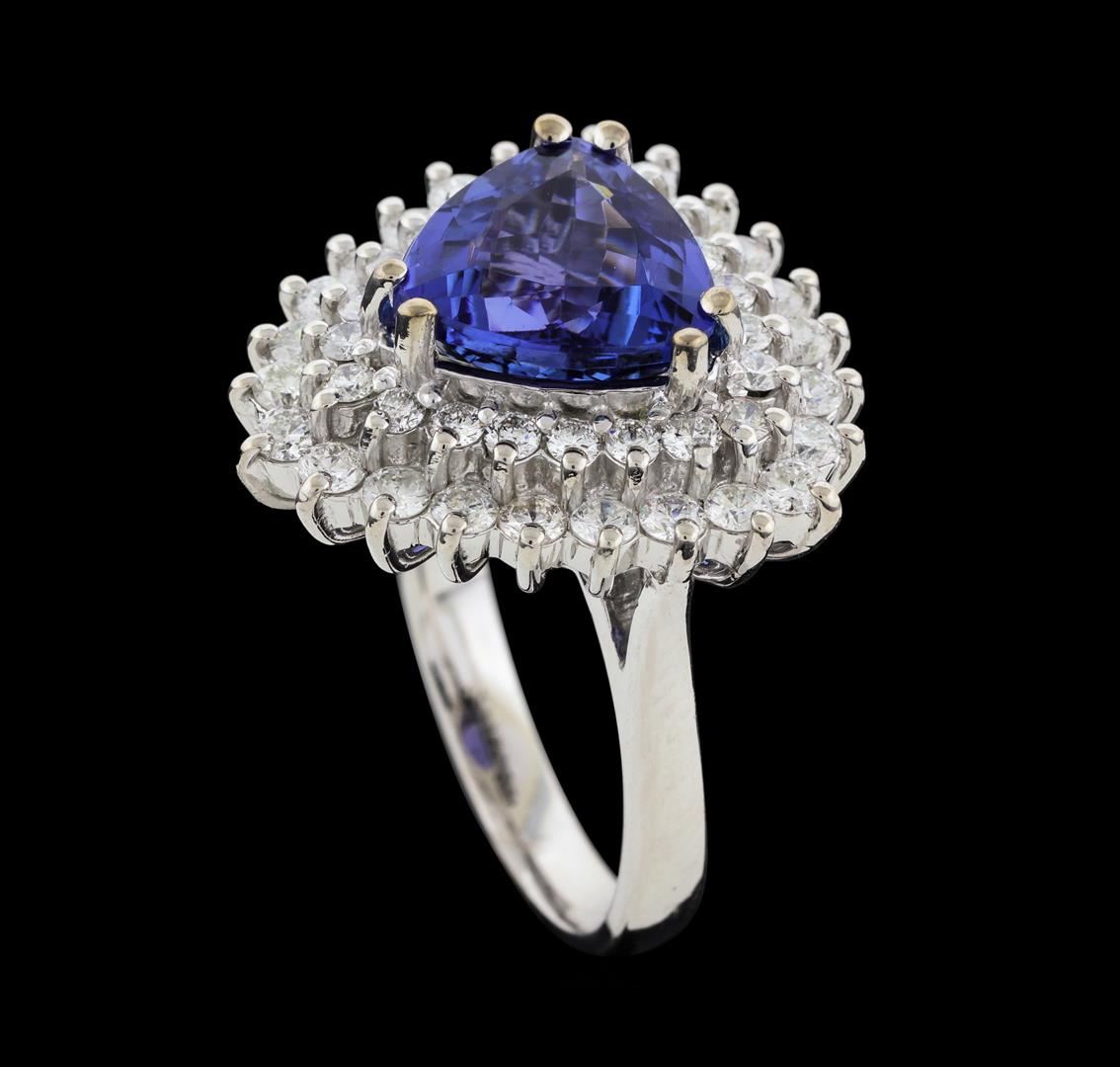 One electronically tested 14KT white gold lady's cast fashion ring with a double basket halo with a bright polish finish. The featured lady's ring has a shank measuring 2.84 millimeters wide. Identified with markings of 'K14'. Condition is new, good workmanship. Containing: One prong set triangle modified brilliant cut natural tanzanite, measuring 9.84 x 9.70 x 5.18mm, (depth est.) 15%. bulge factor, approximate weight of 3.62ct., clarity is eye clean, medium dark, moderately strong, violet color, (GIA V 6/4), cut is very good. Transmitting light with no distortion, transparent. Colored gemstones are presumed to have been subjected to commonly used enhancement processes. Graded in the setting. Twenty-Four prong set round brilliant cut diamonds, measuring 2.20 - 2.10 x 1.31mm (depth est.) approximate total weight of 24 Stones = 0.89ct. Graded in the setting. Clarity SI-1 to I-1. Color: G - H Cut Good Twenty-One prong set round brilliant cut diamonds, measuring 1.80 - 1.70 x 1.09mm (depth est.) approximate total weight of 21 Stones = 0.43ct. Graded in the setting. Clarity SI-1 to I-1. Color: F - G Cut Good. Total Weight of Colored Stones 3.62ct.. Total Weight of Diamonds 1.32ct.. Total Weight of Ring 9.20gm. GAS Appraised at $8,715.00.