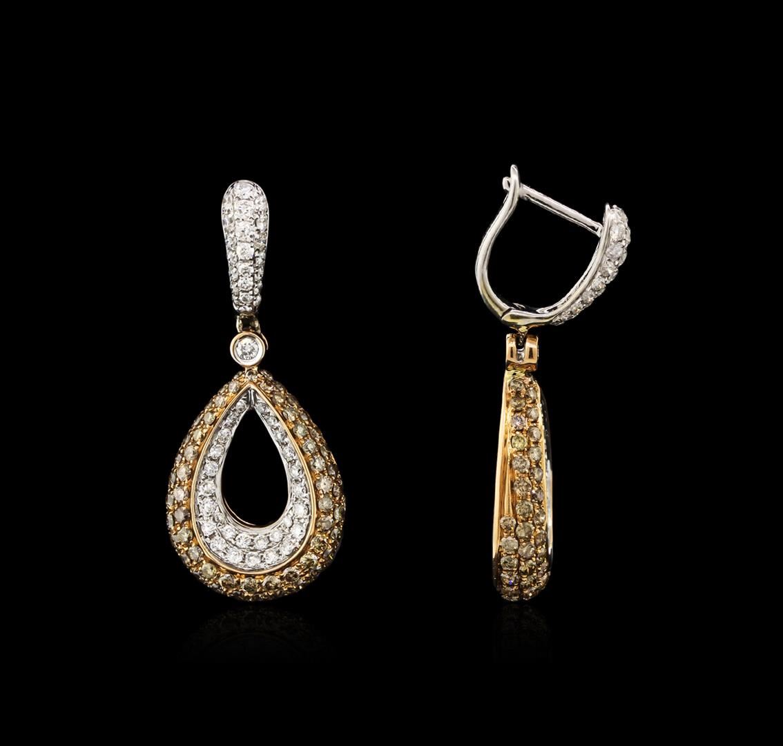 One pair electronically tested 18KT white gold ladies cast diamond earrings with hinged clip backs with a bright polish finish. Identified with markings of "750". Condition is new. Containing: One Hundred prong set round brilliant cut diamonds, measuring 1.50 - 1.30 x 0.84mm (depth est.) approximate total weight of 100 Stones = 1.45ct. Clarity: SI-1 to I-1. Color: I - J, Cut is Good. One Hundred Forty-Four prong set round brilliant cut diamonds, measuring 1.60 - 1.40 x 0.90mm (depth est.) approximate total weight of 144 Stones = 2.17ct. Clarity: SI-2 to I-1, color of fancy brown, cut is good. Diamonds are graded in the mounting, unless otherwise stated. Total Weight of Diamonds 3.62ct. Total Weight of Earrings 9.20 grams. GGL Appraised at $6,065.00.