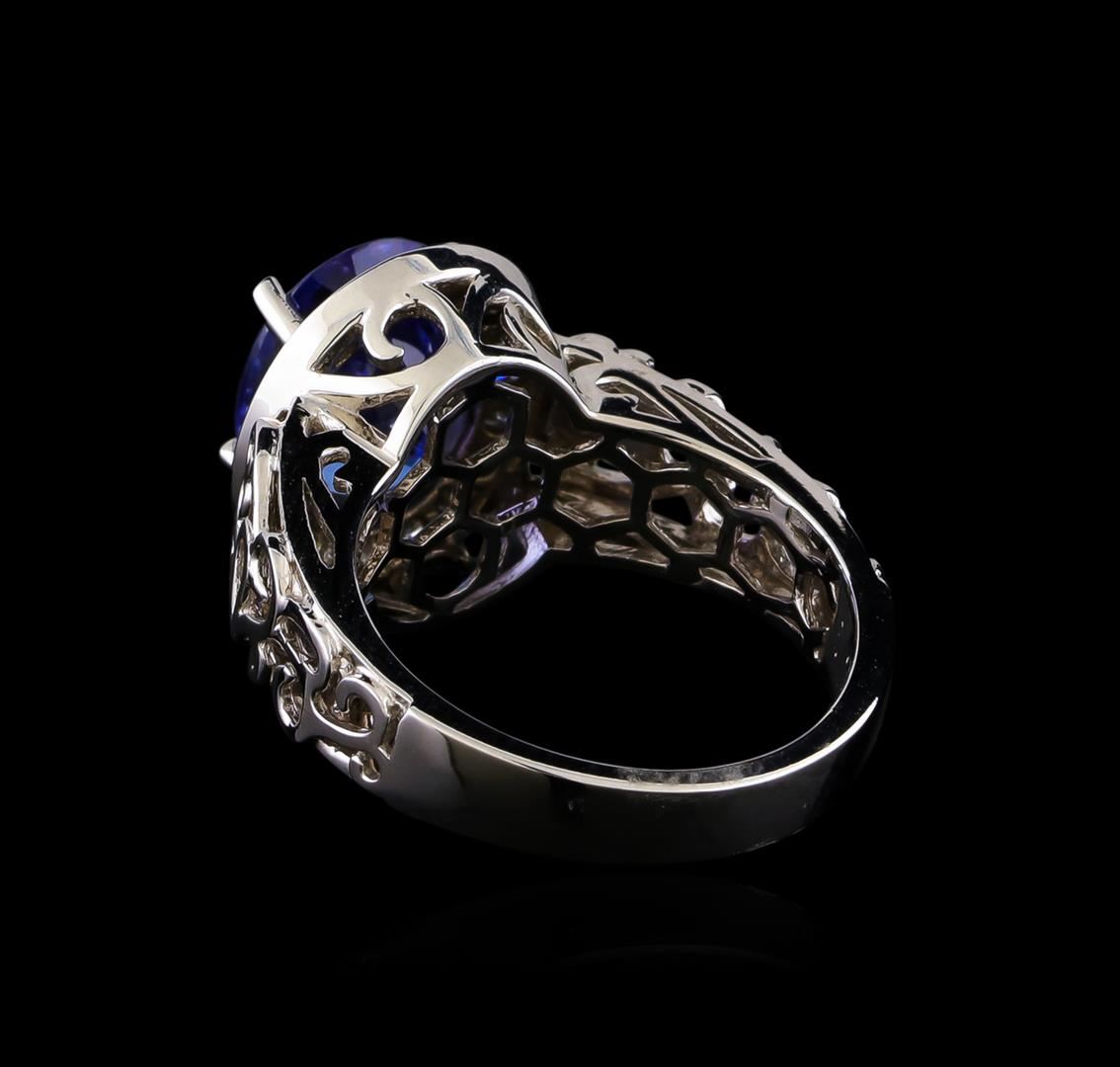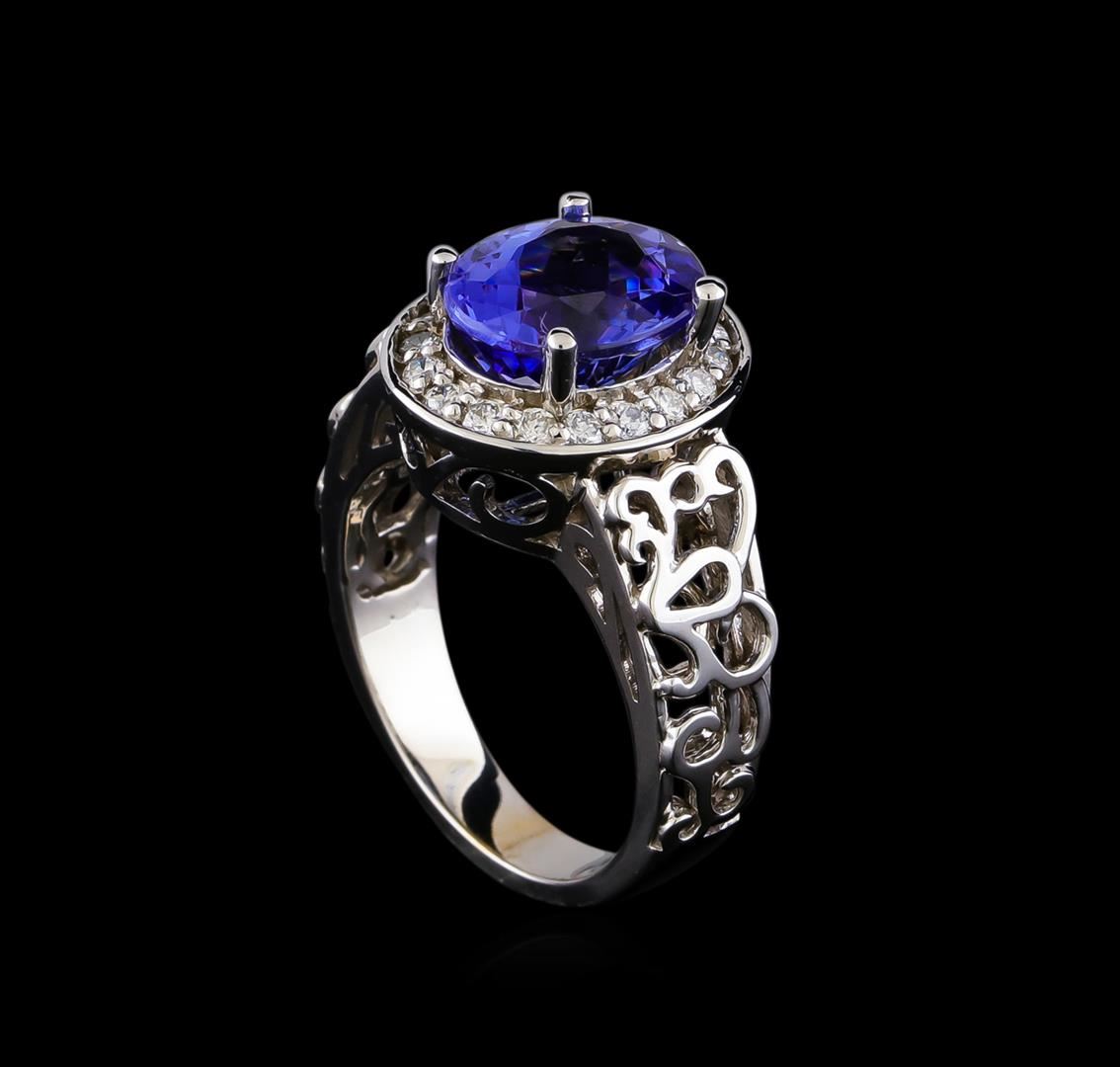 One electronically tested 14KT white gold lady's cast fashion ring with a cathedral shank with a bright polish finish. The featured lady's ring has a filagree shank measuring 3.36 millimeters in width. Identified with markings of "14K". Condition is new, good workmanship. Containing: One prong set oval modified brilliant cut natural tanzanite, measuring 10.33 x 8.54 x 5.54mm, (depth est.) 8%. bulge factor, approximate weight of 3.63ct., clarity is eye clean, medium dark, moderately strong, bluish violet color, (GIA bV 6/4), cut is very good. Transmitting light with no distortion, transparent. Colored gemstones are presumed to have been subjected to commonly used enhancement processes. Graded in the setting. Eighteen prong set round brilliant cut diamonds, measuring 1.80 - 1.70 x 1.08mm (depth est.) approximate total weight of 18 Stones = 0.35ct. Graded in the setting. Clarity: SI-1 to SI-2. Color: H - I. Cut Good. Total Weight of Colored Stones 3.63ct. Total Weight of Diamonds 0.35ct. Total Weight of Ring 6.20gm. GAS Appraised at $7,890.00.