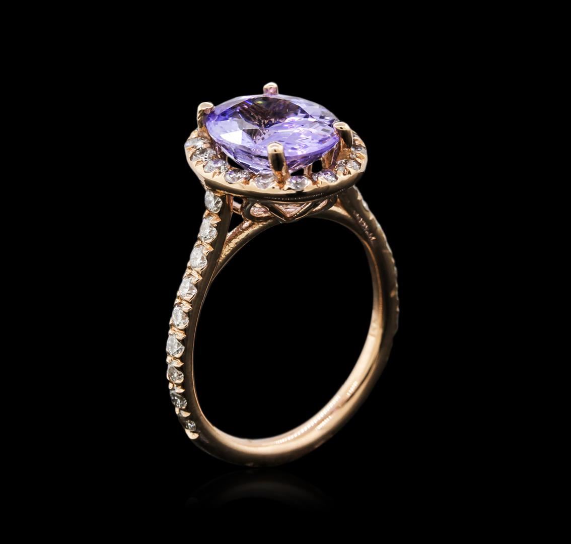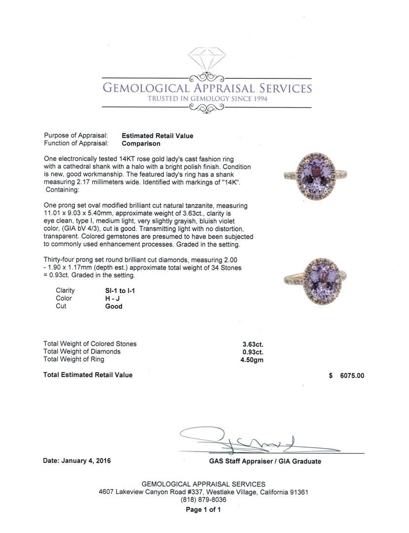 One electronically tested 14KT rose gold lady's cast fashion ring with a cathedral shank with a halo with a bright polish finish. The featured lady's ring has a shank measuring 2.17 millimeters wide. Identified with markings of "14K". Condition is new, good workmanship. Containing: One prong set oval modified brilliant cut natural tanzanite, measuring 11.01 x 9.03 x 5.40mm, approximate weight of 3.63ct., clarity is eye clean, type I, medium light, very slightly grayish, bluish violet color, (GIA bV 4/3), cut is good. Transmitting light with no distortion, transparent. Colored gemstones are presumed to have been subjected to commonly used enhancement processes. Graded in the setting. Thirty-Four prong set round brilliant cut diamonds, measuring 2.00 - 1.90 x 1.17mm (depth est.) approximate total weight of 34 Stones = 0.93ct. Graded in the setting. Clarity: SI-1 to I-1. Color: H - Good. Total Weight of Colored Stones 3.63ct. Total Weight of Diamonds 0.93ct. Total Weight of Ring 4.50gm. GAS Appraised at $6,075.00.