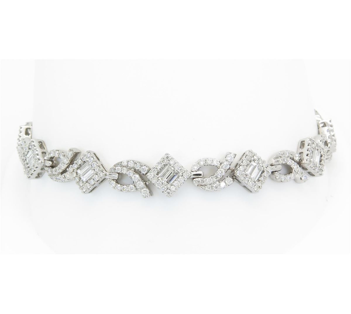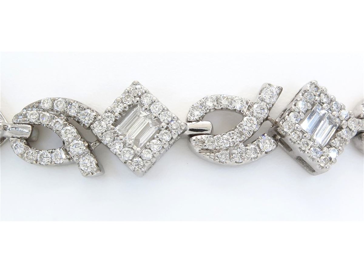 One tested 18K white gold diamond bracelet. Containing: 365 Round Brilliant Cut Diamonds, 24 Baguette Cut Diamonds. Clarity: I-SI, Color: G-H. Approximate total diamond weight: 3.63CTW. Diamonds are graded in the mounting, unless otherwise stated. Weight of bracelet: 15.8 grams. Size: 7.5" long.