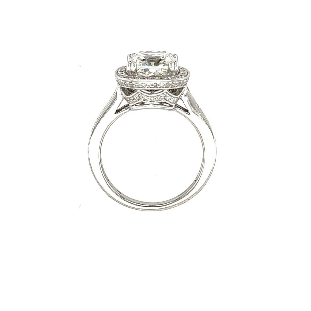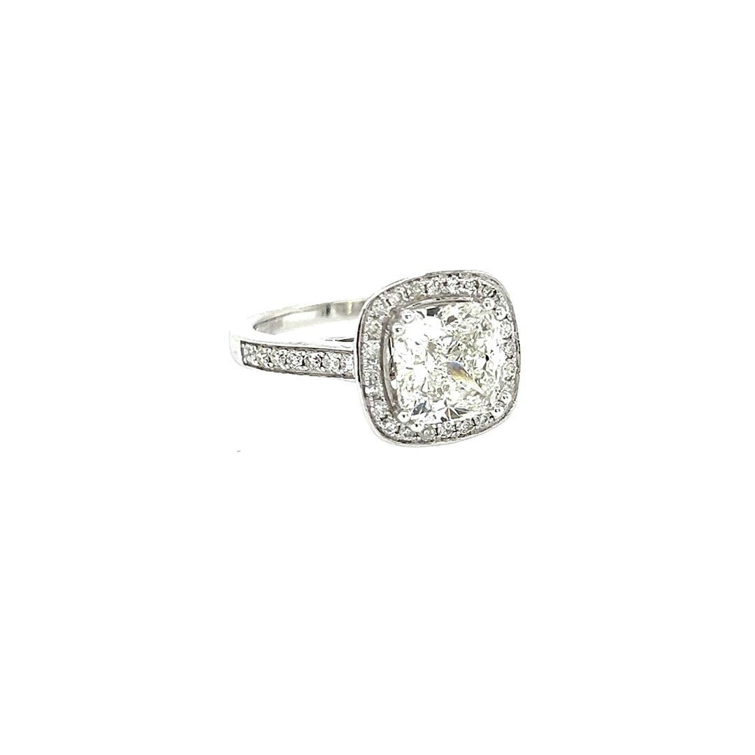 One electronically tested 14KT white gold lady's combination cast & assembled wedding ring with a cushion basket halo with a bright polish finish. Condition is new, good workmanship. The featured lady's ring has a crown design motif with a shank measuring 2.00mm in width. Identified with markings of "14K". Containing: One prong set cushion cut diamond, measuring 7.94 x 7.81 x 5.55mm (depth est.) , 7.00% GTCF approximate weight of 3.01ct. Graded loose prior to setting in the EGL Laboratory, Report #913531801D. Color G Clarity VS-2 Cut Excellent Thirty-eight bead set round brilliant cut diamonds, measuring 1.50 - 1.50 x 0.93mm (depth est.) approximate total weight of 38 Stones = 0.47ct. Graded in the setting. Color G-H Clarity VS-2 to SI-2 Cut Very Good Seventy prong set round brilliant cut diamonds, measuring 0.90 - 0.85 x 0.53mm (depth est.) approximate total weight of 70 Stones = 0.16ct. Graded in the setting. Color G-H Clarity VS-2 to SI-2 Cut Very Good Total Weight of Diamonds 3.64ct. Total Weight of Ring 4.20gm Total Estimated Retail Value $ 122940.00