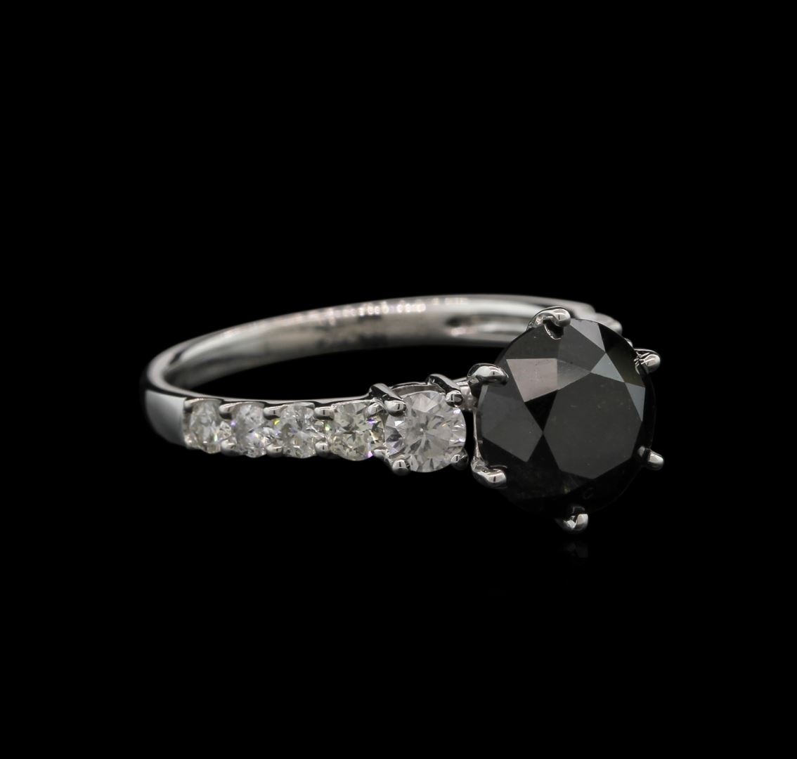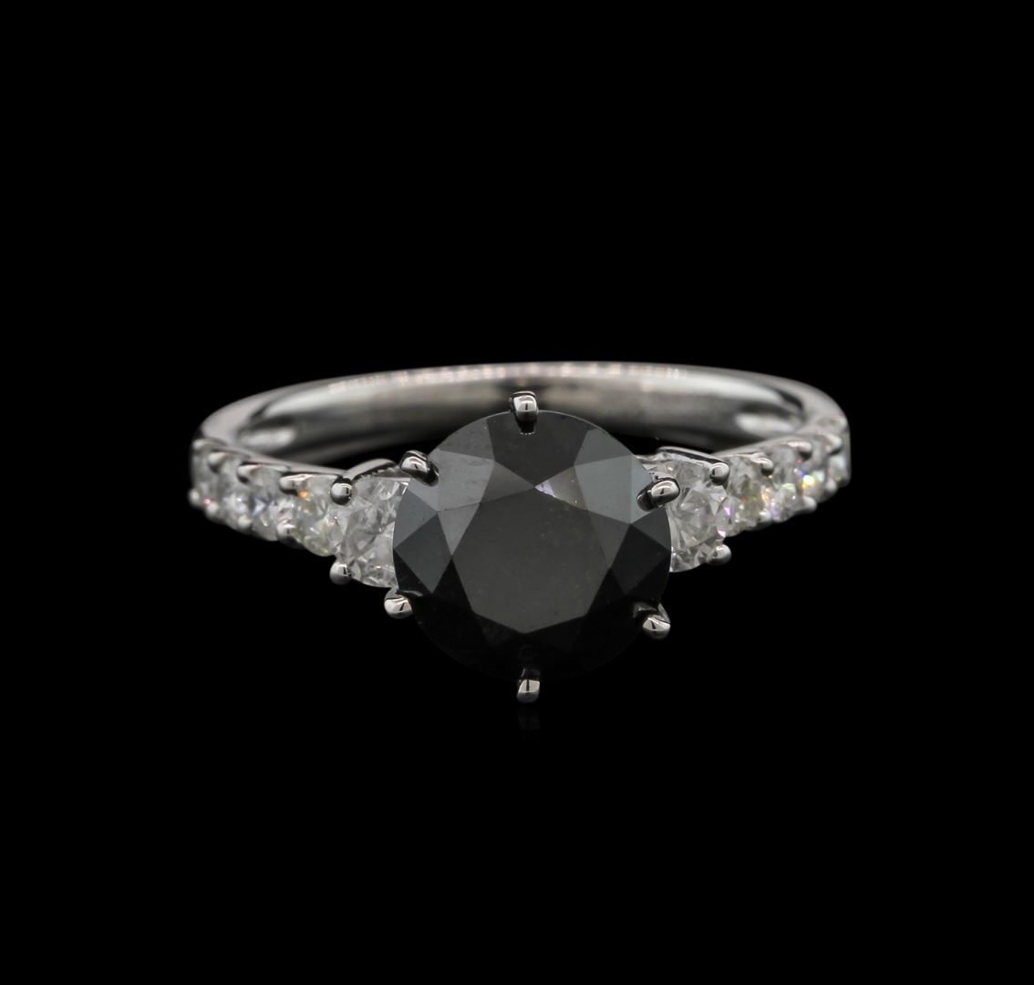 One ring featuring: 14KT white gold weighing 2.89 grams containing one prong set round black diamond center stone with a total weight of 2.92ct and prong set round white diamonds with a total weight of 0.72ct.